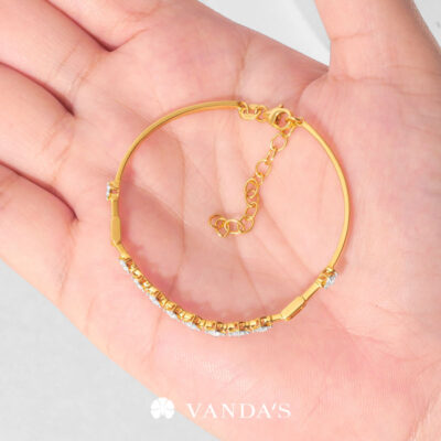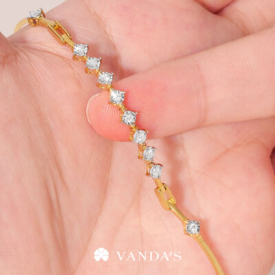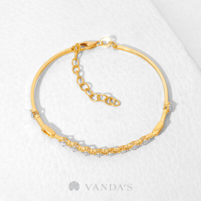 AMMY – สร้อยข้อมือทองคำแท้ประดับเพชรแท้ สร้อยข้อมือดีไซน์ร่วมสมัย หรูหราในทุกดีเทล ตัวเรือนทองคำแท้เปอร์เซ็นต์สูง ดีไซน์ทรงคล้ายกำไล ประกอบด้วยองค์ประกอบ 3 ส่วนเชื่อมต่อกันอย่างกลมกลืนและยืดหยุ่น รับเข้ากับข้อมืออย่างพอดี