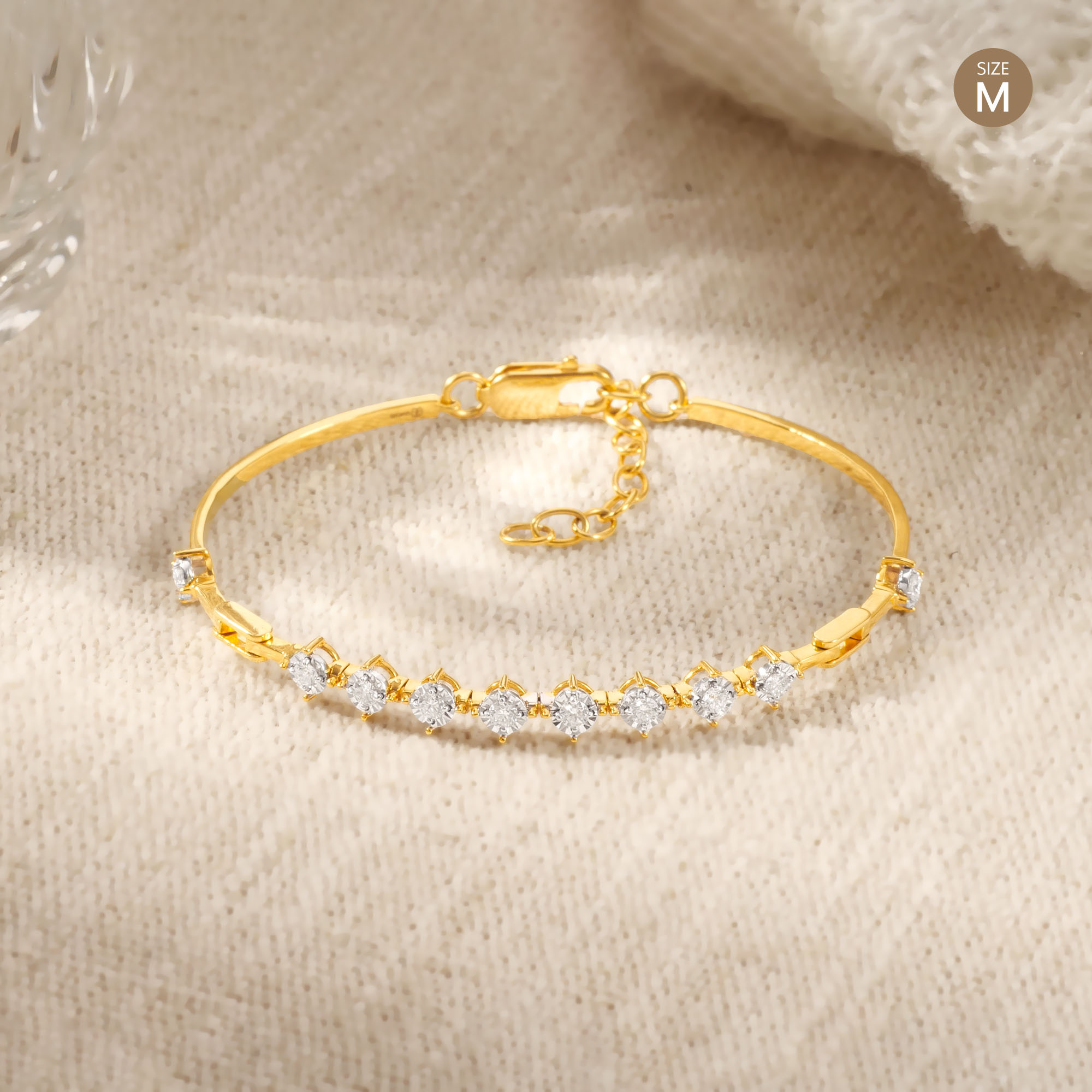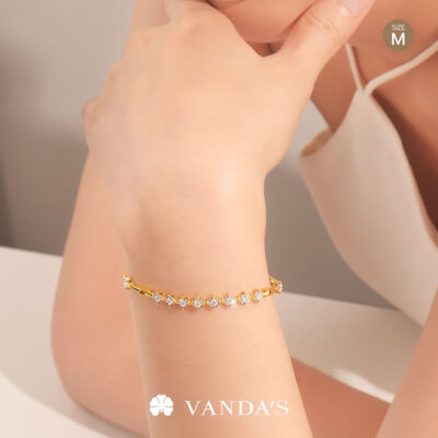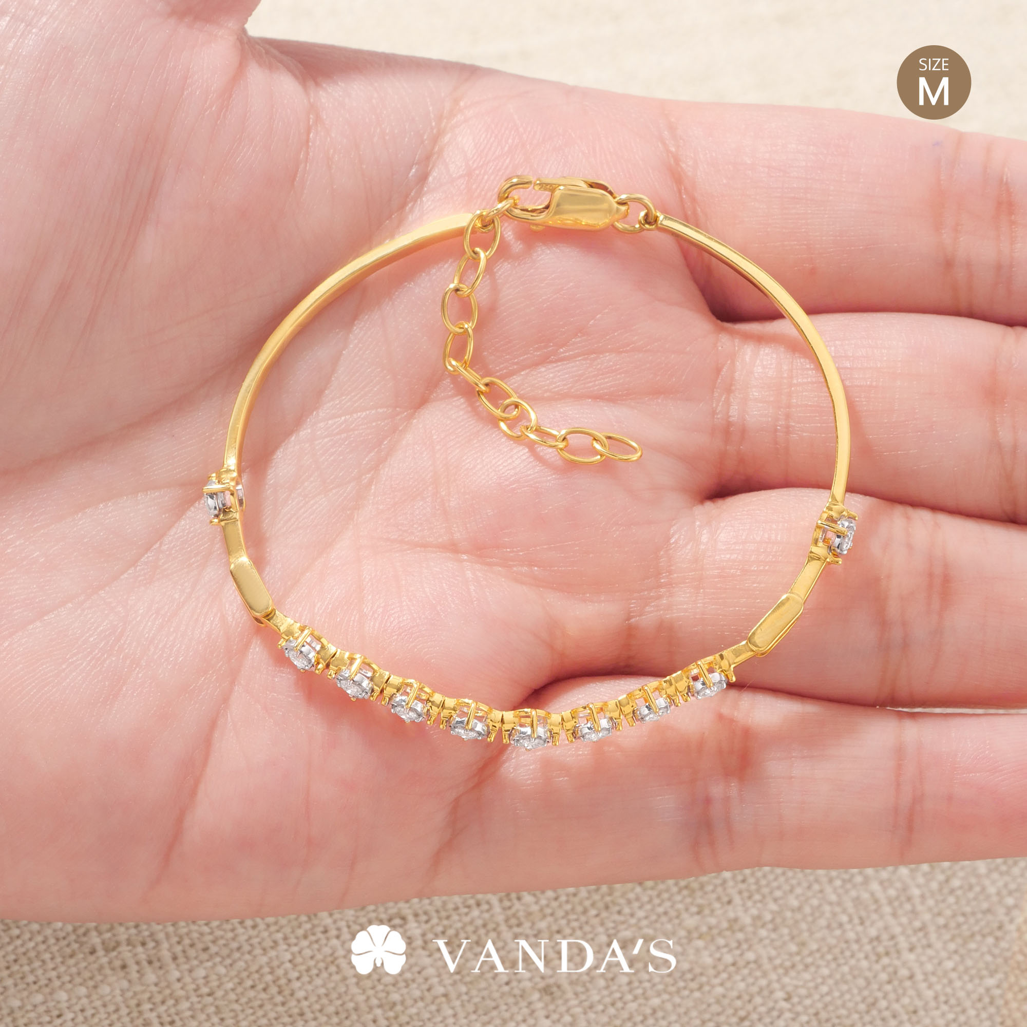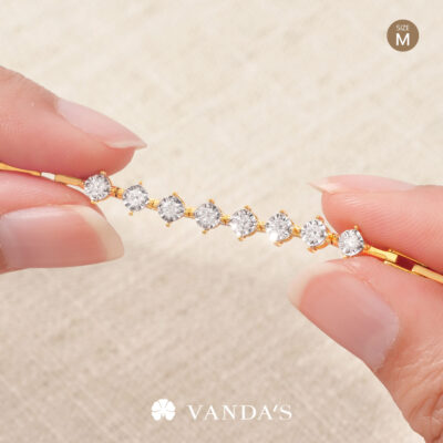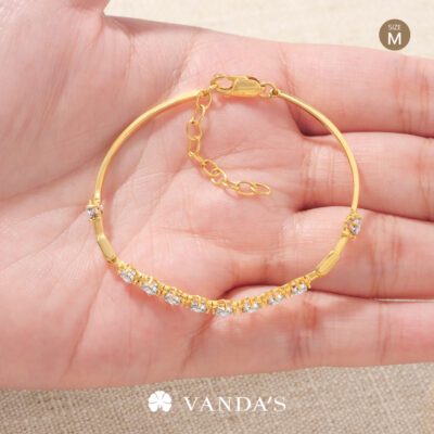 ตัวเรือนทองคำแท้โทนสว่างช่วยขับผิวให้ดูมีออร่า ดีไซน์ทรง กึ่งกำไล (Bangle-Bracelet) ที่ผสานความสง่างามของกำไลเข้ากับความอ่อนตัวของสร้อยข้อมือ พร้อมตะขอแบบ ก้ามปู (Lobster Clasp) ที่แข็งแรง ใช้งานง่าย และสามารถปรับความยาวได้ตั้งแต่ 15–18 ซม.