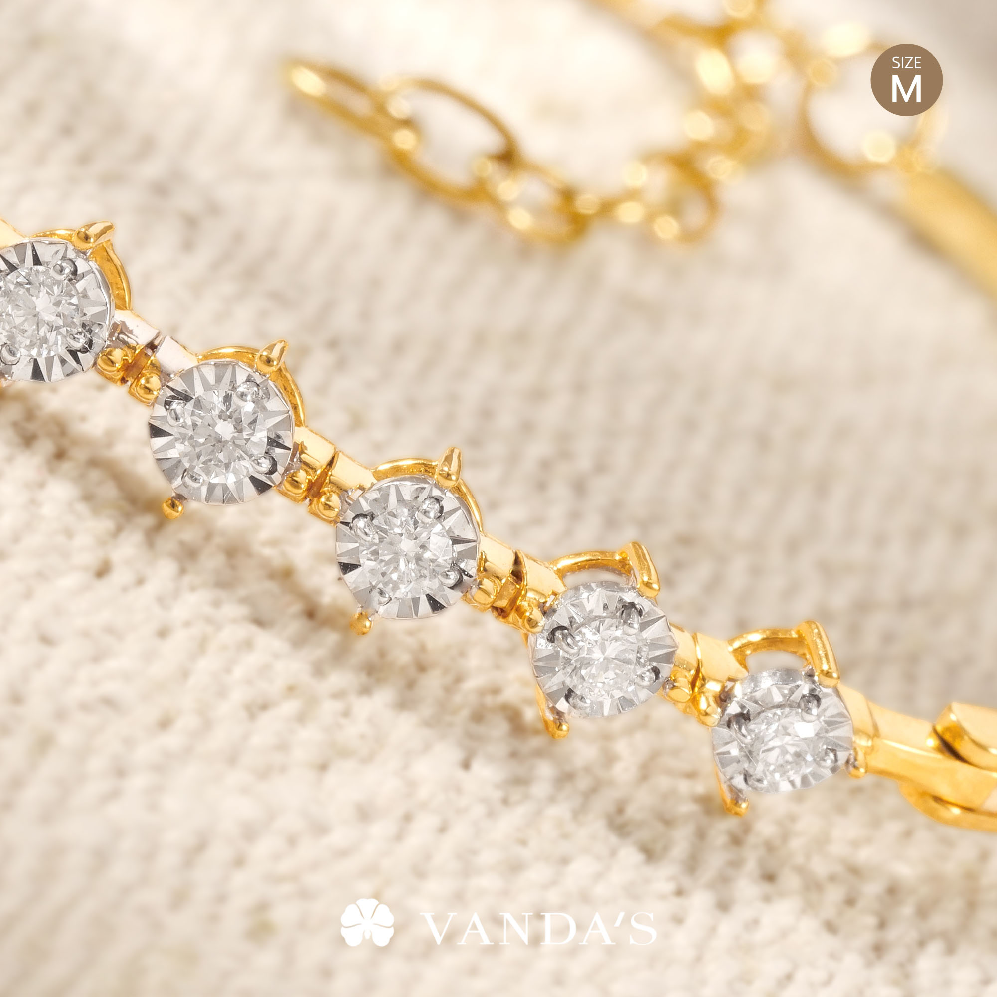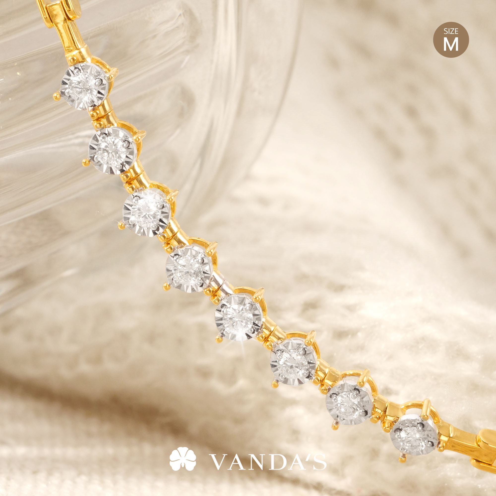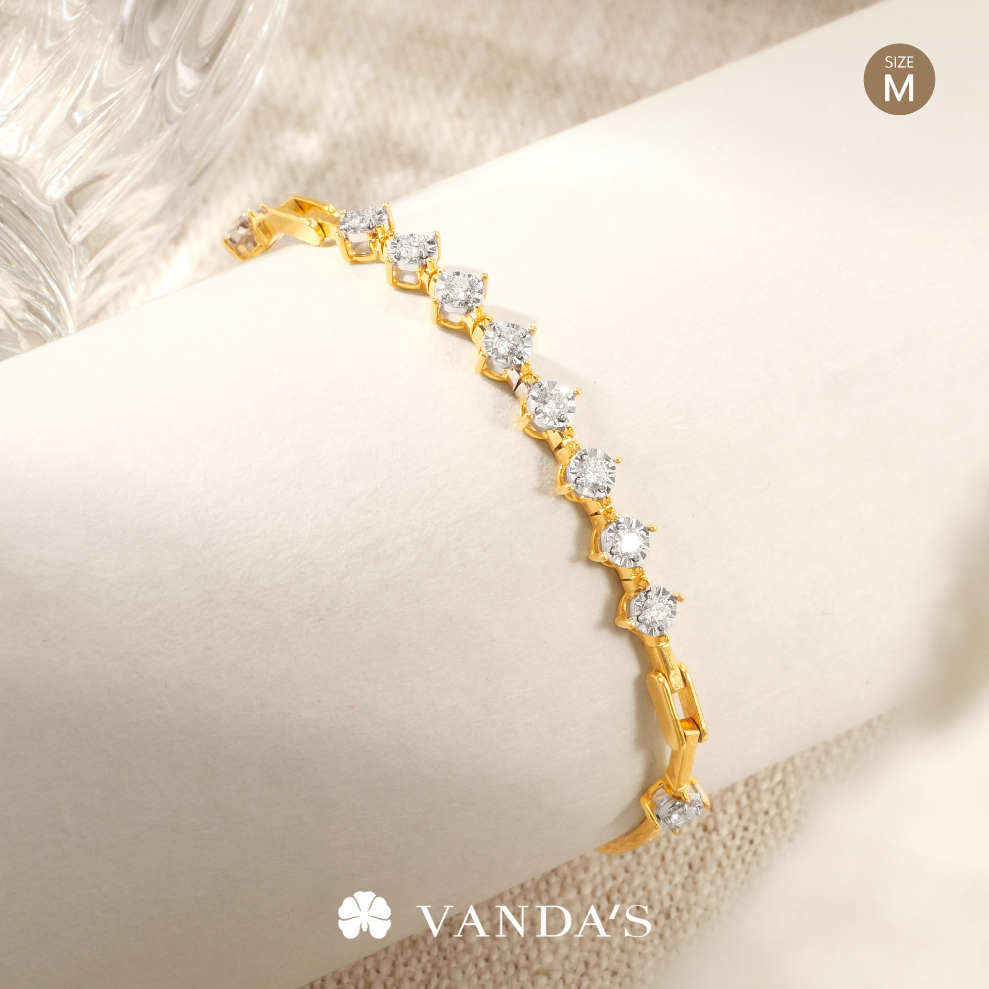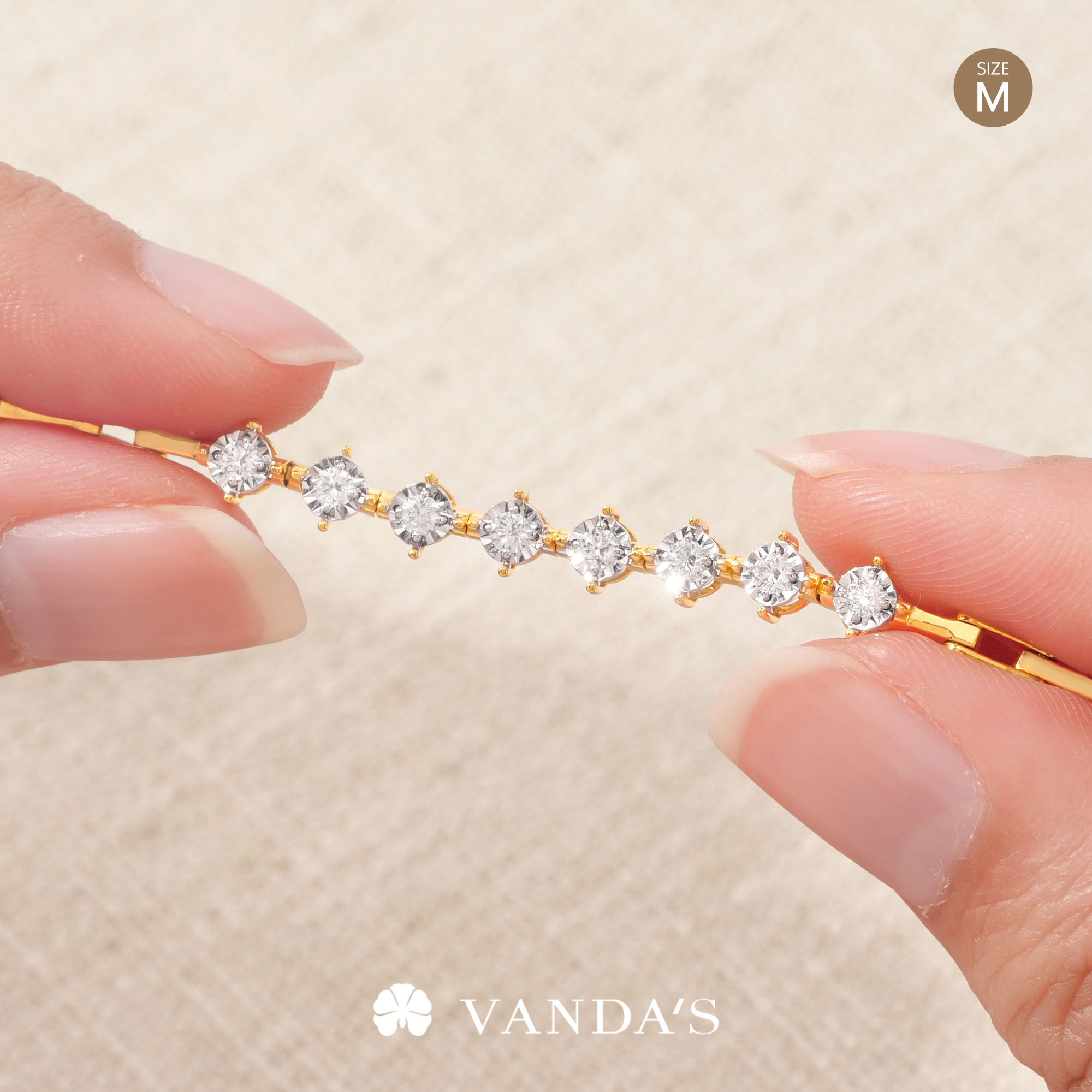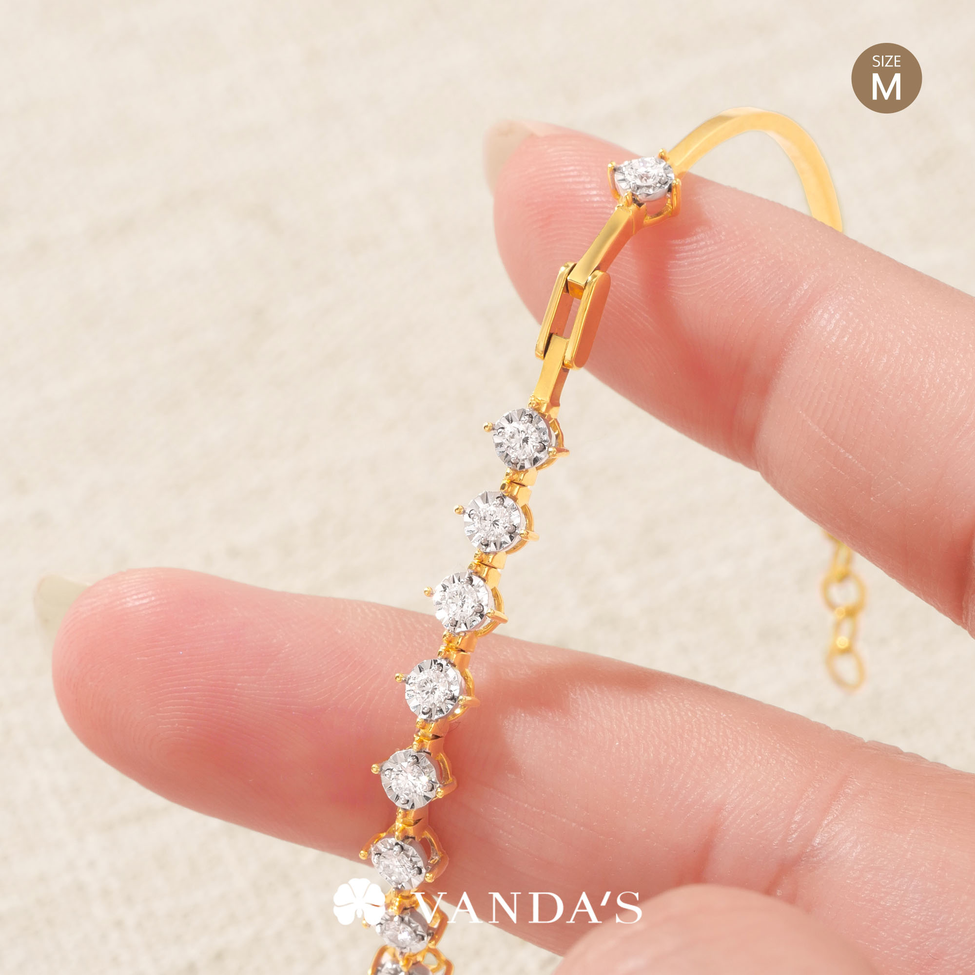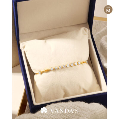 สร้อยข้อมือทองคำแท้ประดับเพชรแท้ ดีไซน์ร่วมสมัยที่ผสานความเรียบหรูและโครงสร้างแบบกำไลเข้าไว้ด้วยกันอย่างลงตัว โครงสร้างของชิ้นงานประกอบด้วยองค์ประกอบ 3 ส่วน ที่เชื่อมต่อกันอย่างกลมกลืน ทำให้ตัวสร้อยมีความยืดหยุ่น รับเข้ากับรูปข้อมือได้อย่างพอดี พร้อมความสบายในการสวมใส่ในทุกวัน