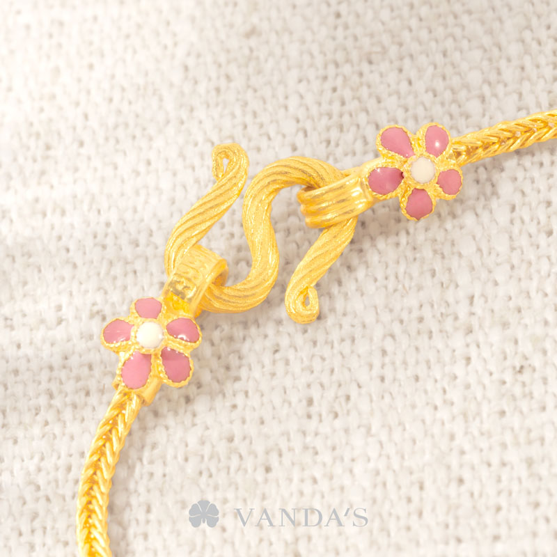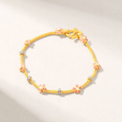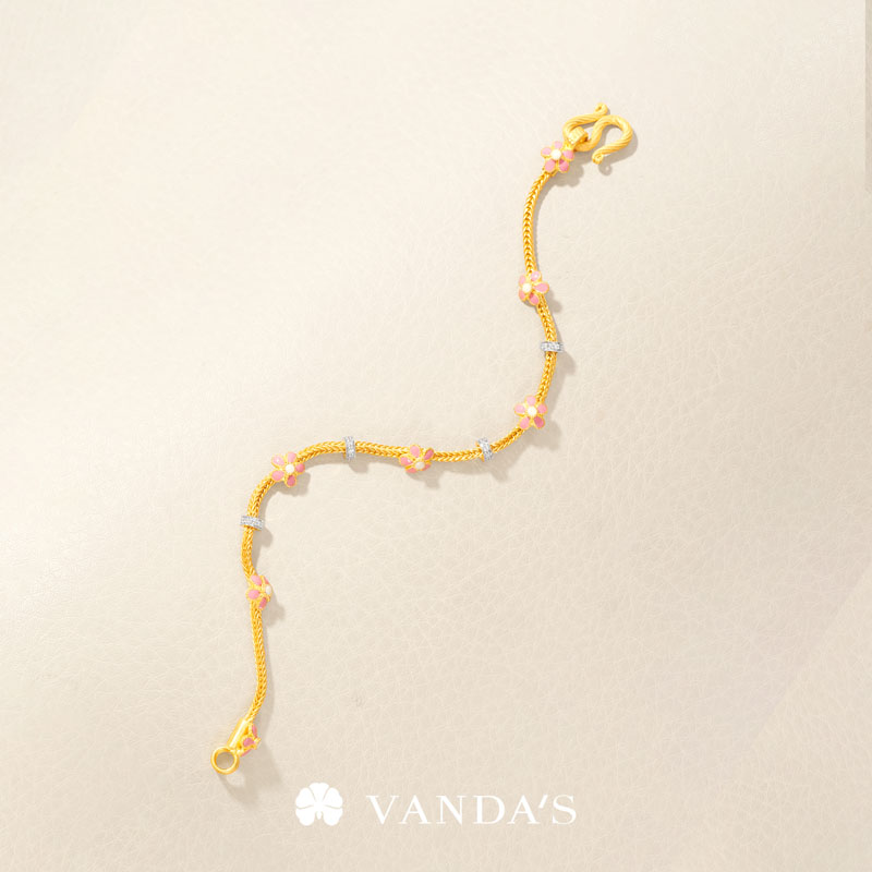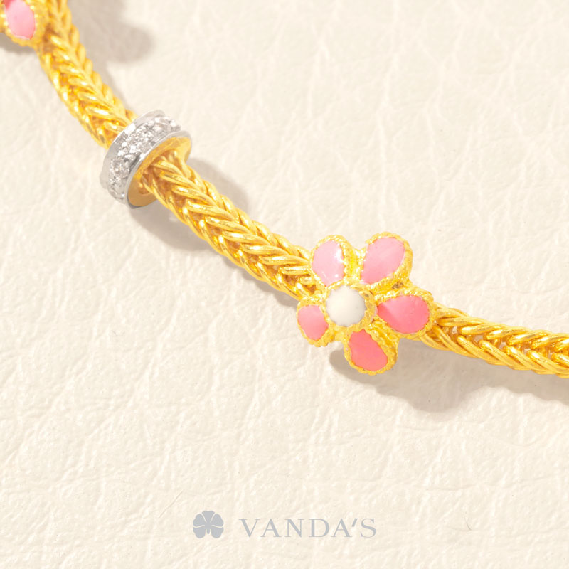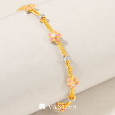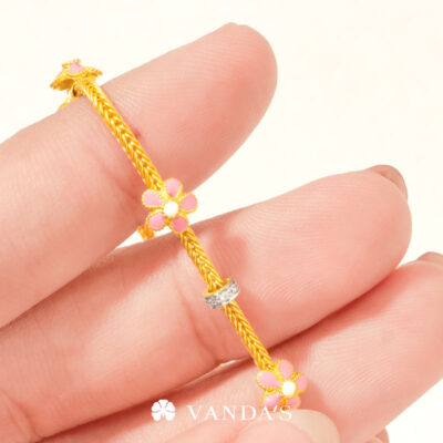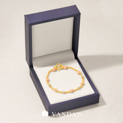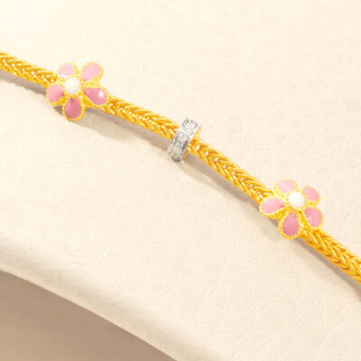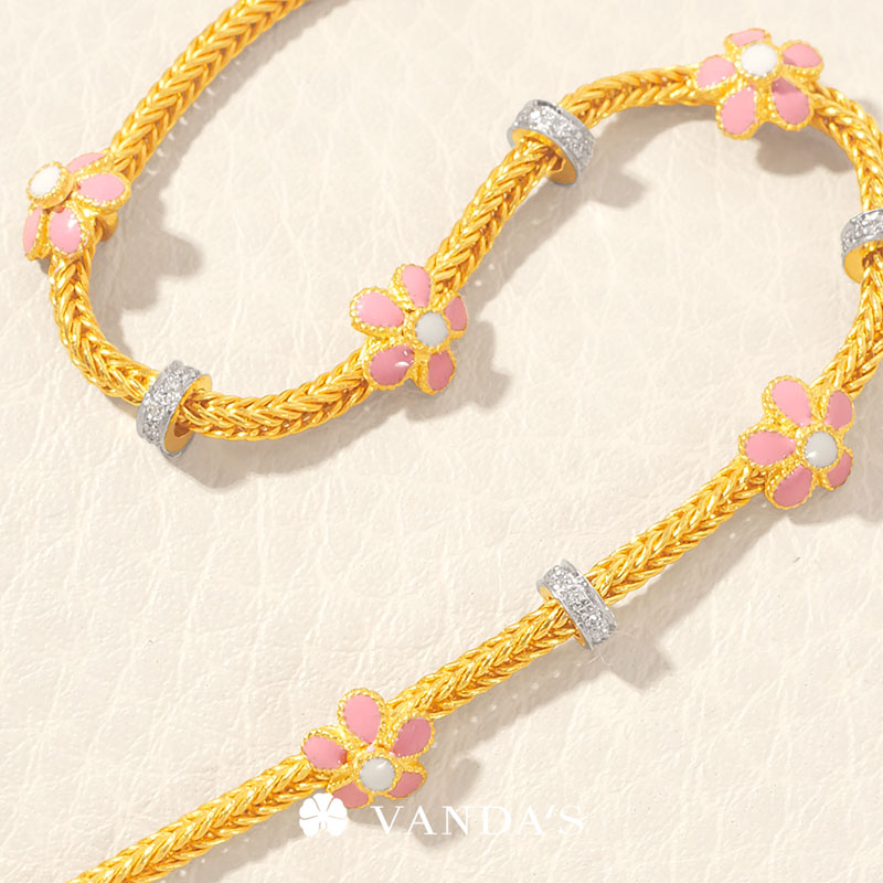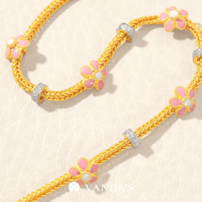 โดดเด่นด้วยเหลี่ยมมุมคู่ขนานที่ให้ความรู้สึกหรูหรา ทันสมัย แต่ยังคงกลิ่นอายของศิลปะดั้งเดิมไว้อย่างลงตัว เติมเต็มความละมุนด้วย “ดอกไม้ลงยา” สีชมพูพาสเทล ซึ่งผ่านการผสมสีเฉพาะเพื่อให้ได้โทนที่อ่อนหวานเป็นธรรมชาติ แทรกตัวอย่างประณีตตลอดเส้น เพิ่มเสน่ห์ที่นุ่มนวล และสร้างเอกลักษณ์เฉพาะตัวให้กับชิ้นงาน