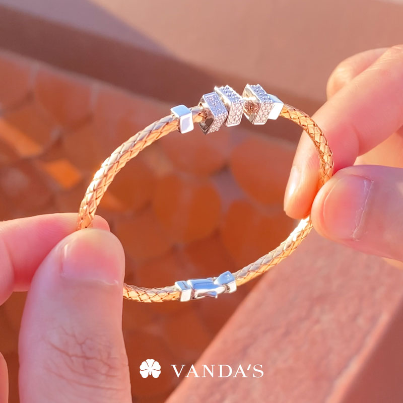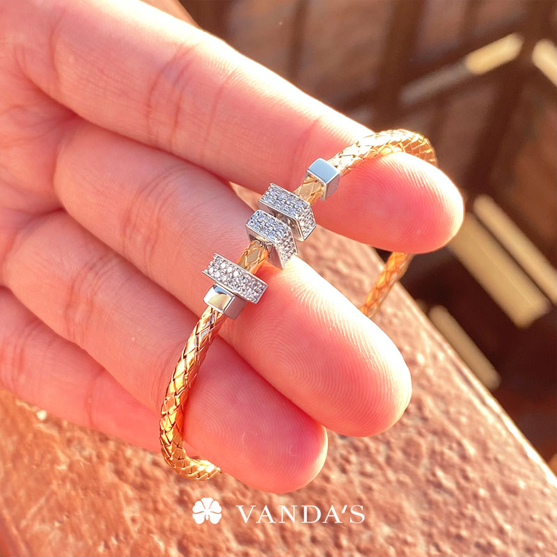 หน้ากำไลตกแต่งด้วยอะไหล่ทองคำขาวทรงสี่เหลี่ยมประดับเพชร 3 ชิ้น (Movable) สามารถขยับได้ เพิ่มมิติและลูกเล่นให้กับชิ้นงานอย่างลงตัว