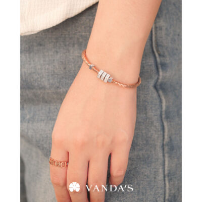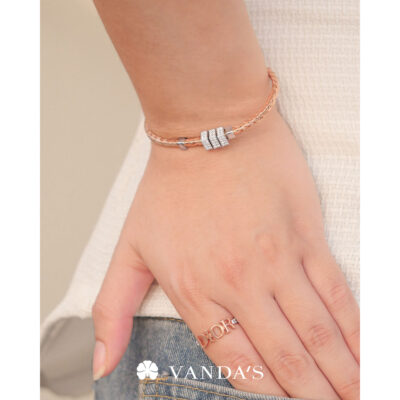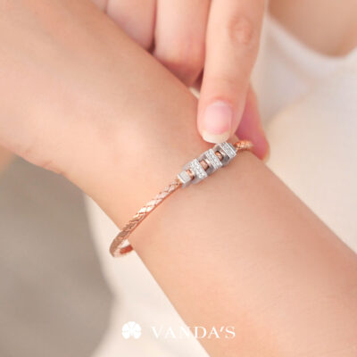กำไลตัวเรือนทองคำชมพู (Pink Gold) ดีไซน์ลายถักสาน ถ่ายทอดแรงบันดาลใจจากภูมิปัญญาไทย ผสานงานจิวเวลรี่สมัยใหม่ ตัวเรือนขึ้นรูปทรงรี ขนาดพอดีข้อมือ สวมใส่สบาย งานเรียบเนียน ไม่บาดผิว