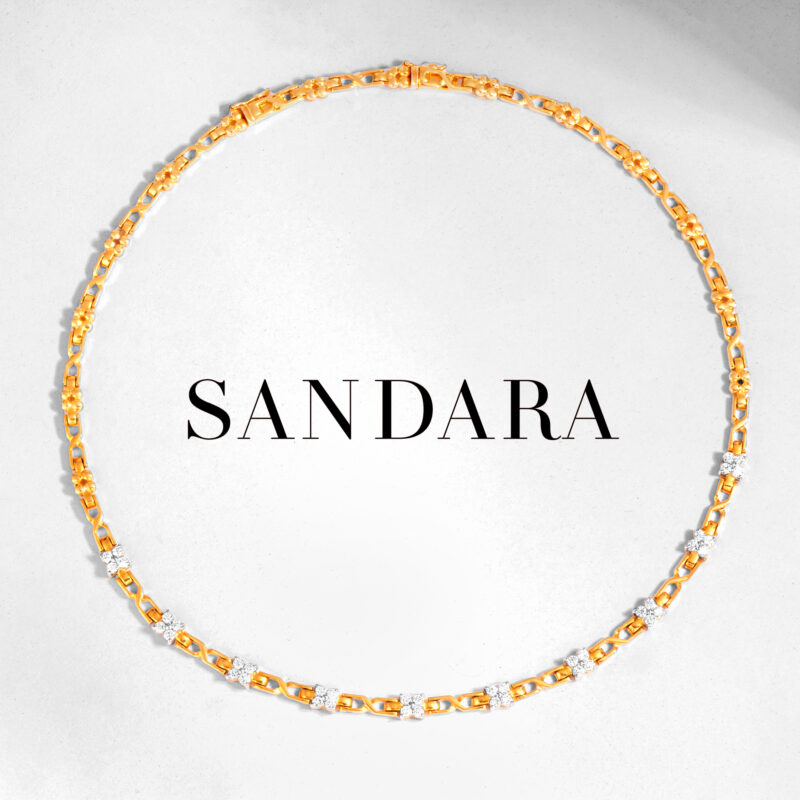 Sandara แรงบันดาลใจจากใบโคลเวอร์ (Clover) สัญลักษณ์แห่งความโชคดี รังสรรค์เรือนเพชรด้วยทองคำเป็นใบโคลเวอร์ 4 กลีบ จำนวน 10 ดอก คัดสรรเพชรแท้เบลเยี่ยมคัท ทรงกลม Brilliant Cut น้ำ 100 D-Color/VVS1 จำนวน 40 เม็ด น้ำหนักรวม 1.52 กะรัต ฝังด้วยเทคนิคการฝังแบบหนามเตย ทำให้เพชรเล่นแสงไฟได้ดี มีความระยิบระยับ เรียงร้อยเป็นข้อๆ เชื่อมต่อด้วยทองคำเกลี้ยงเงารูปทรงตัวเอ็กซ์ (X) ในระยะที่เท่าๆ กัน ด้วยการเรียงร้อยแบบข้อต่อ ทำให้สายสร้อยมีความพลิ้วไหว ขยับได้ตามสรีระและการเคลื่อนไหวของผู้สวมใส่