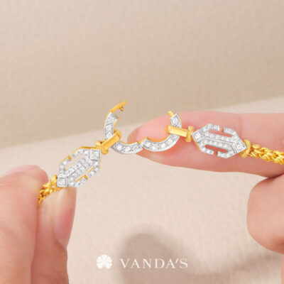 ลวดลายทองคำแท้ 99.99% ที่รังสรรค์ด้วยเทคนิคงานทองจากช่างฝีมือ ถ่ายทอดความประณีตผ่านการร้อยถักห่วงทองไขว้สลับขึ้นเป็นลวดลายหูกระต่ายที่กลมมน สวยงาม และร่วมสมัย ขั้วเพชรดีไซน์คลาสสิกทรงหกเหลี่ยม ประดับเพชรแท้เพิ่มความระยิบระยับหรูหรา มาพร้อมระบบล็อกซ่อน 2 ชั้นแบบ 2 in 1 เหมาะกับผู้ที่ชื่นชอบความงามของทองคำในดีไซน์ร่วมสมัยที่เปี่ยมฟังก์ชันและรสนิยม