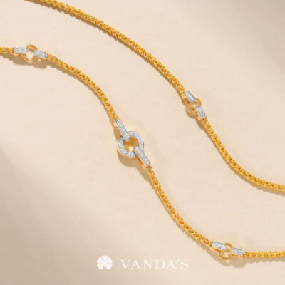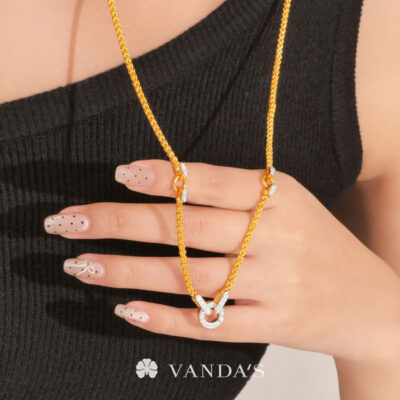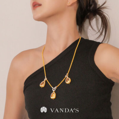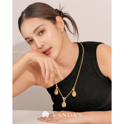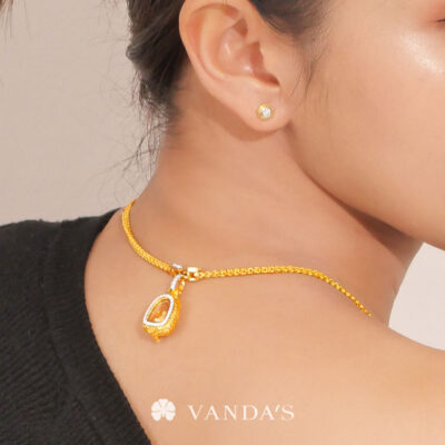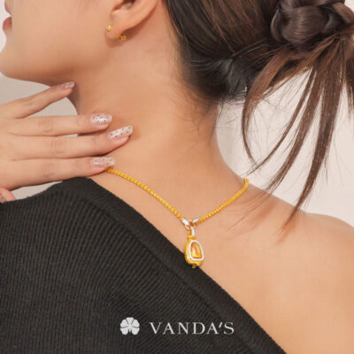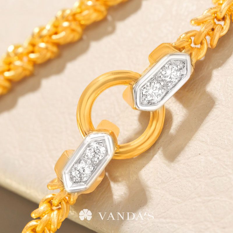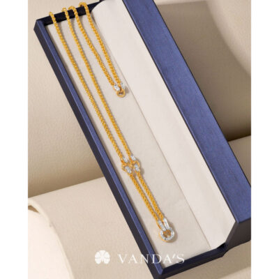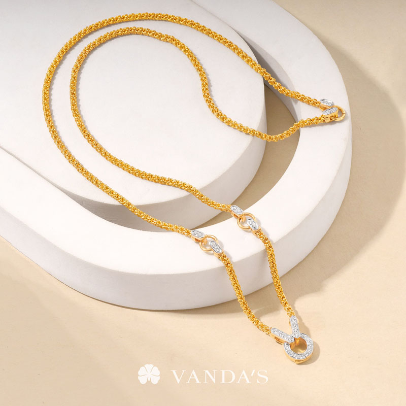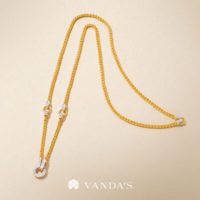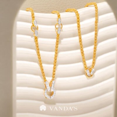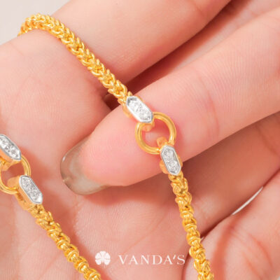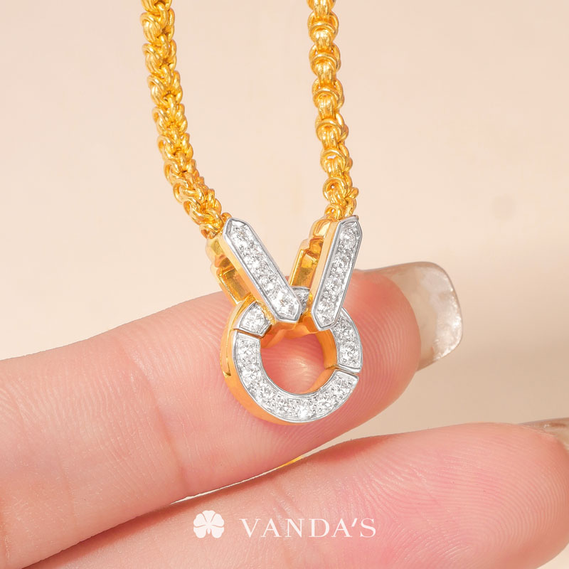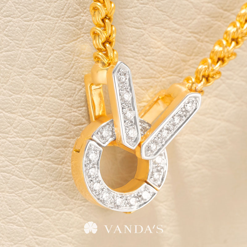 งานทองฝีมือปราณีตโดยช่างมากประสบการณ์ บรรจงร้อยถักห่วงทองไขว้สลับ สร้างลวดลายคล้าย “หูกระต่าย” อย่างประณีต ขั้วเพชรดีไซน์คลาสสิกในรูปทรงหกเหลี่ยม พร้อมขั้วจี้ทรงกลมที่ออกแบบให้ใช้งานได้แบบ 2-in-1 ทั้งเป็นตะขอสร้อยในตัว และห่วงสำหรับห้อยจี้ สามารถใส่จี้ได้สูงสุดถึง 4 ชิ้น