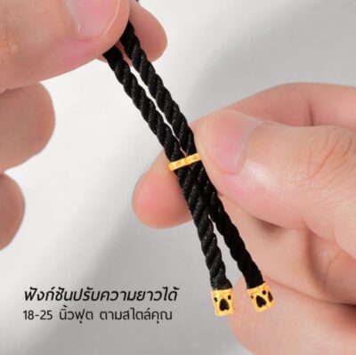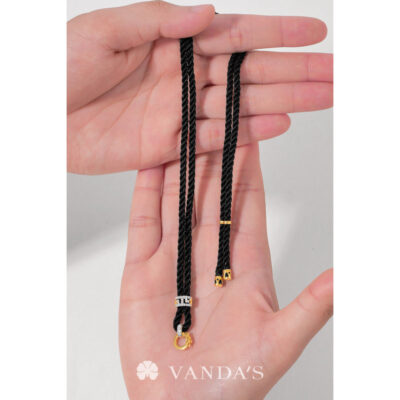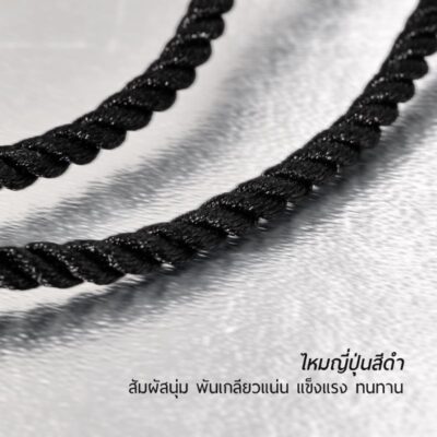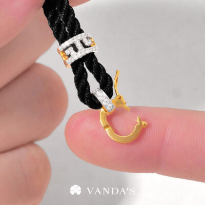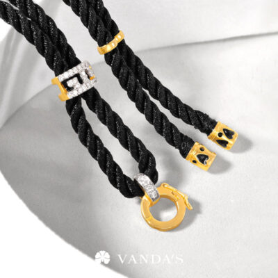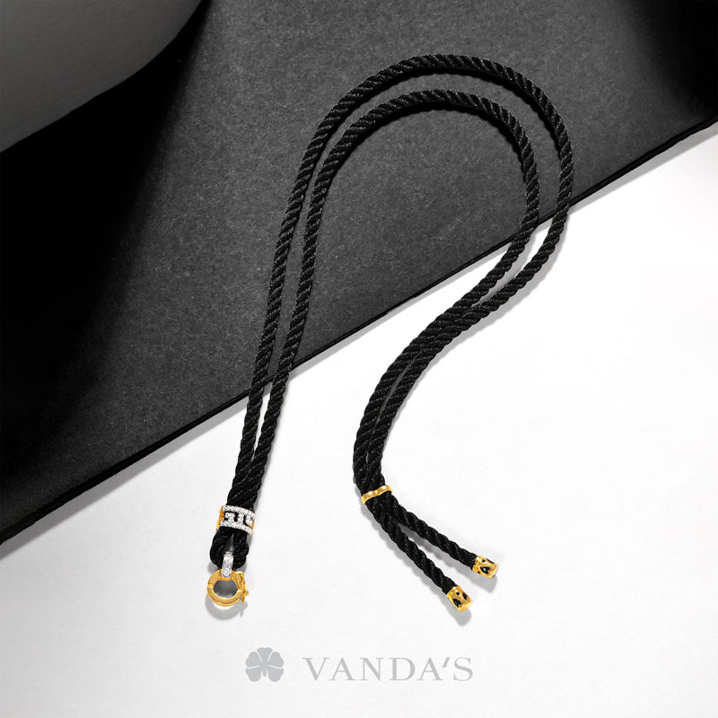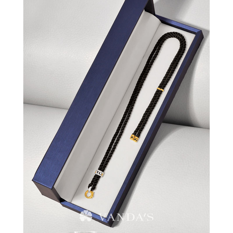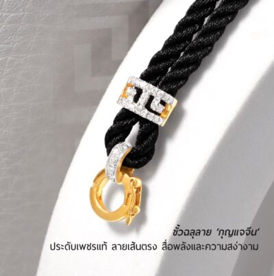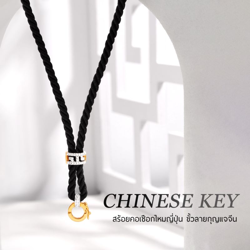 สร้อยคอเชือกไหมญี่ปุ่น สีดำสนิท เงางาม พันเกลียวแน่นหนา ร้อยห่วงทองคำแท้ประดับเพชร สำหรับห้อยจี้ เปิด-ปิด ได้ ด้วยสปริงล็อค 2 ชั้น สามารถเปลี่ยนใส่กับจี้ได้หลากหลาย มาพร้อมดีไซน์จับทองคำแท้เปอร์เซ็นต์สูง ลวดลายกุญแจจีน เพิ่มความมีมิติ ประดับตกแต่งด้วยเพชรแท้ น้ำ 100 D-Color/VVS1 จำนวน 31 เม็ด น้ำหนัก 0.15 กะรัต เทคนิคงานฝังจิกไข่ปลาเล่นไฟสวยงาม ไร้ที่ติ