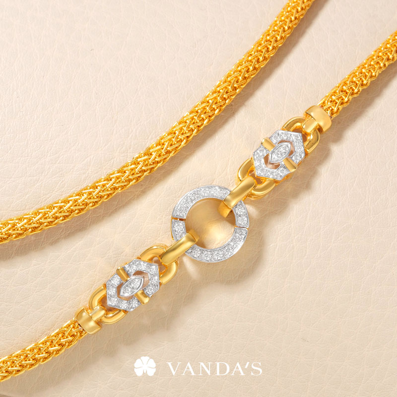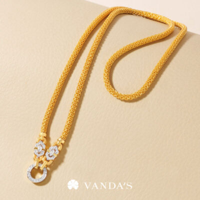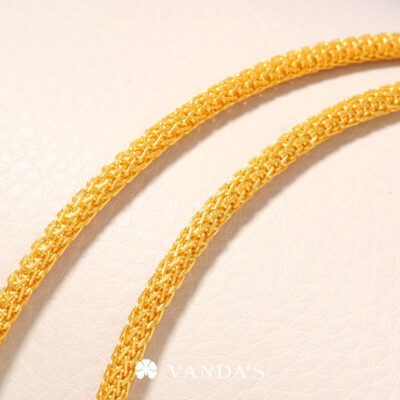 “ถักเถาวัลย์” สร้อยคอทองคำ 99.99% ลวดลายถักเถาวัลย์ กลมมน รังสรรค์เส้นทอง 2 รูปทรง ประกอบเข้าหากันทีละชิ้น ทีละข้อ ด้วยฝีมือช่างผู้มากประสบการณ์ทั้งหมด ทุกระยะต้องเสมอเท่ากันทุดจุด