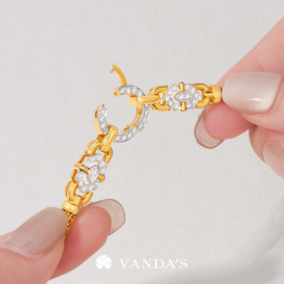 เสน่ห์ของลายนี้จะดูโปร่ง แต่แน่นตัน สัมผัสนุ่ม เมื่อสวมใส่จะแนบรับไปกับคอพอดี ส่วนขั้วเพชรออกแบบพิเศษเป็นทรงสี่เหลี่ยมข้าวหลามตัด ให้ความรู้สึกเรียบเท่ พร้อมประดับเพชรแท้เบลเยี่ยมคัท ทรงกลม Brilliant Cut น้ำ 100 D-Color/VVS จำนวน 42 เม็ด น้ำหนัก 0.48 กะรัต เพิ่มมิติ คมชัดทุกรายละเอียด