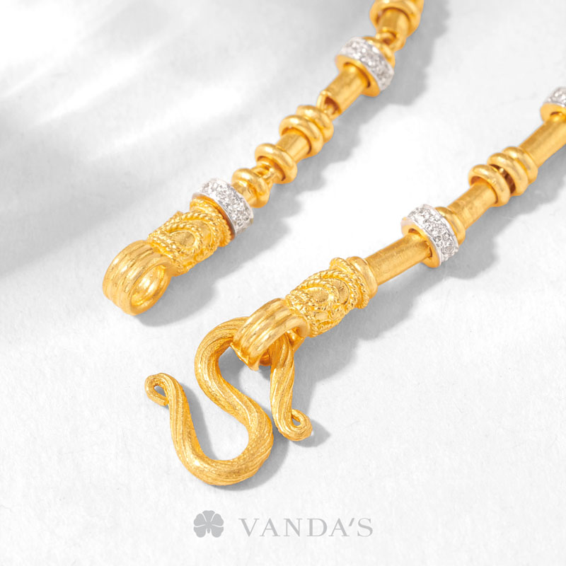 เสริมความงดงามหรูหราด้วยลูกคิดประดับเพชรตลอดทั้งเส้น จับขั้วดีไซน์ลวดลายเกลียวทอง มาพร้อมตะขอเกี่ยวรูปตัวเอส (S) บิดเกลียว ทำให้สร้อยดูอ่อนช้อยยิ่งขึ้น