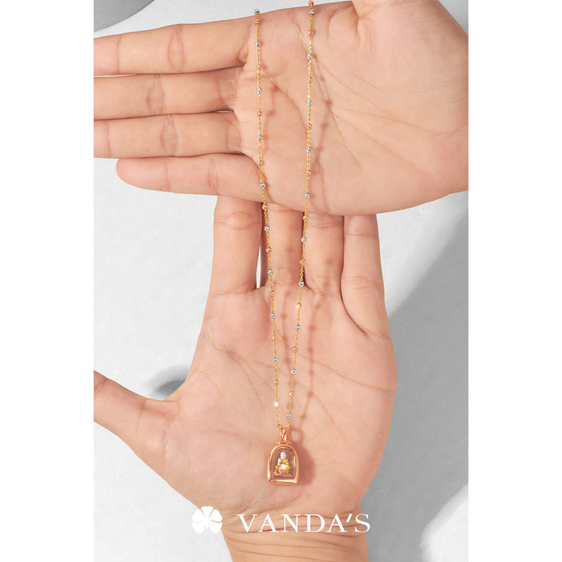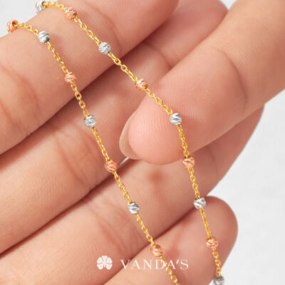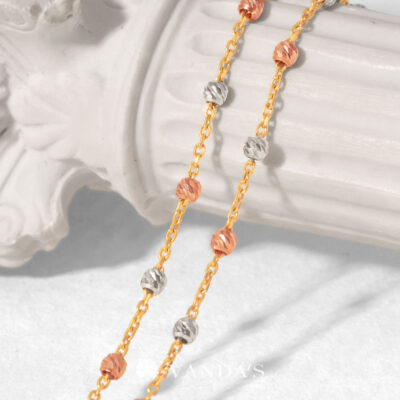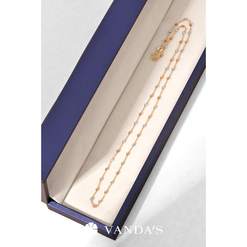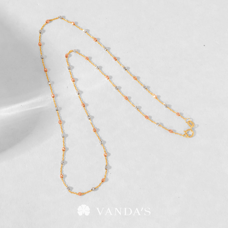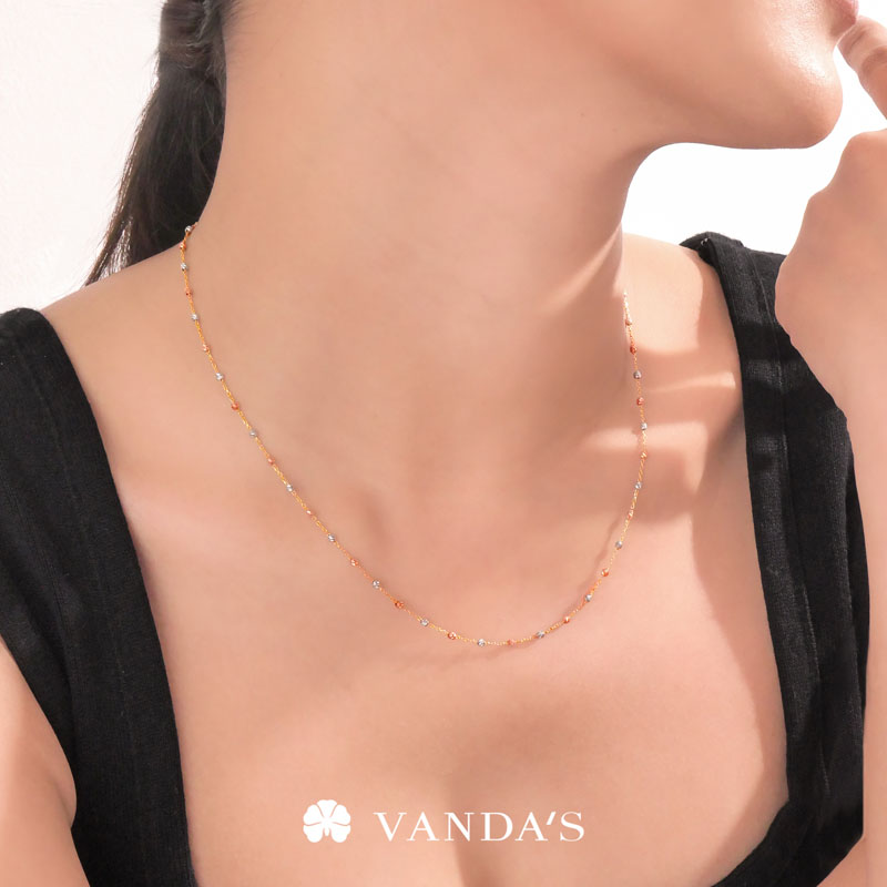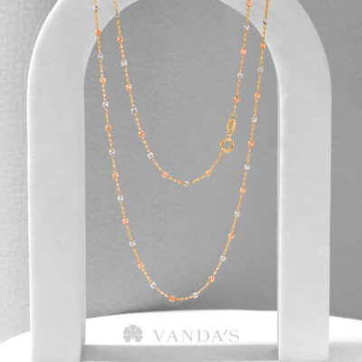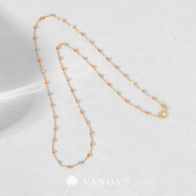 ตัวสร้อยรังสรรค์เป็นลูกประคำจิ๋วทรงกลมตัดลายสีไวท์โกลด์ (WHITE GOLD) สลับสีพิงค์โกลด์ (PINK GOLD) เรียงต่อกันด้วยสายสร้อยลายห่วงโซ่ทองคำ (GOLD) ทีละชิ้น คั่นสลับอย่างประณีตจนกลายเป็นสายสร้อยที่มีจังหวะของลวดลายอย่างลงตัว เมื่อกระทบแสงจะเกิดประกายแวววาว ระยิบระยับ เพิ่มความโดดเด่นให้กับผู้สวมใส่ได้อย่างสง่างาม