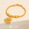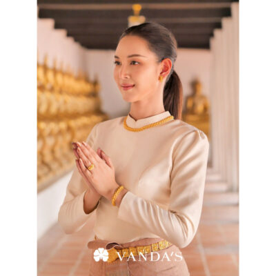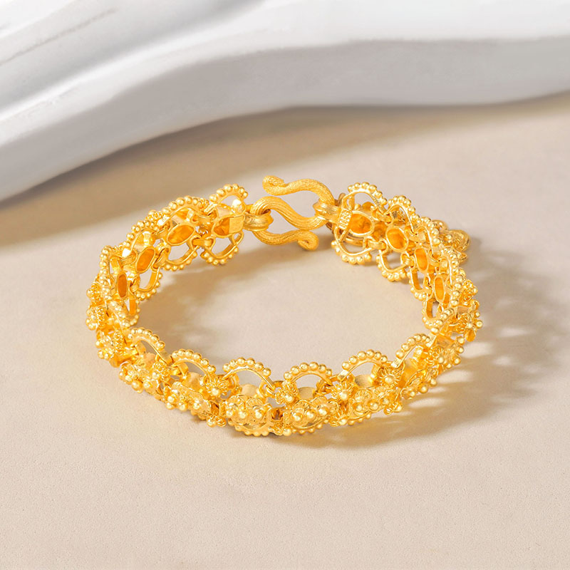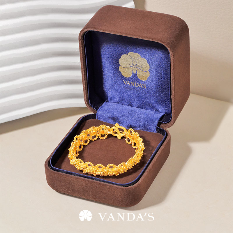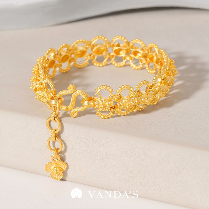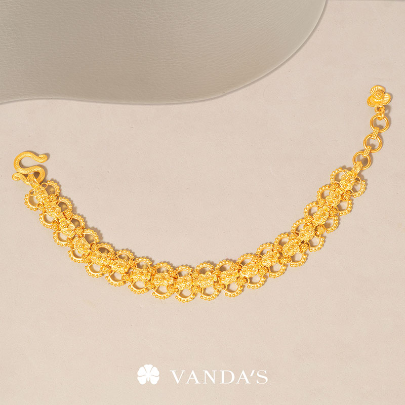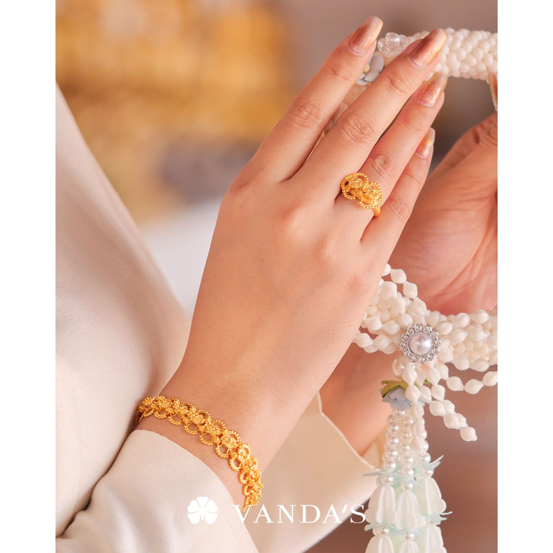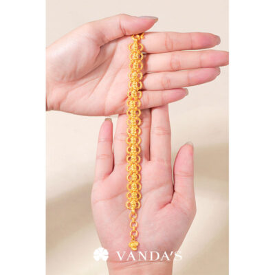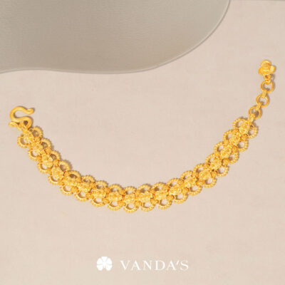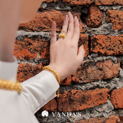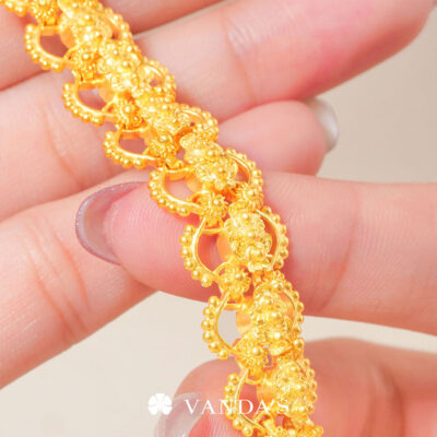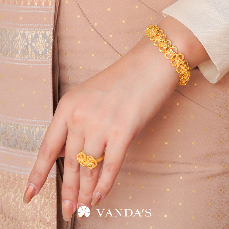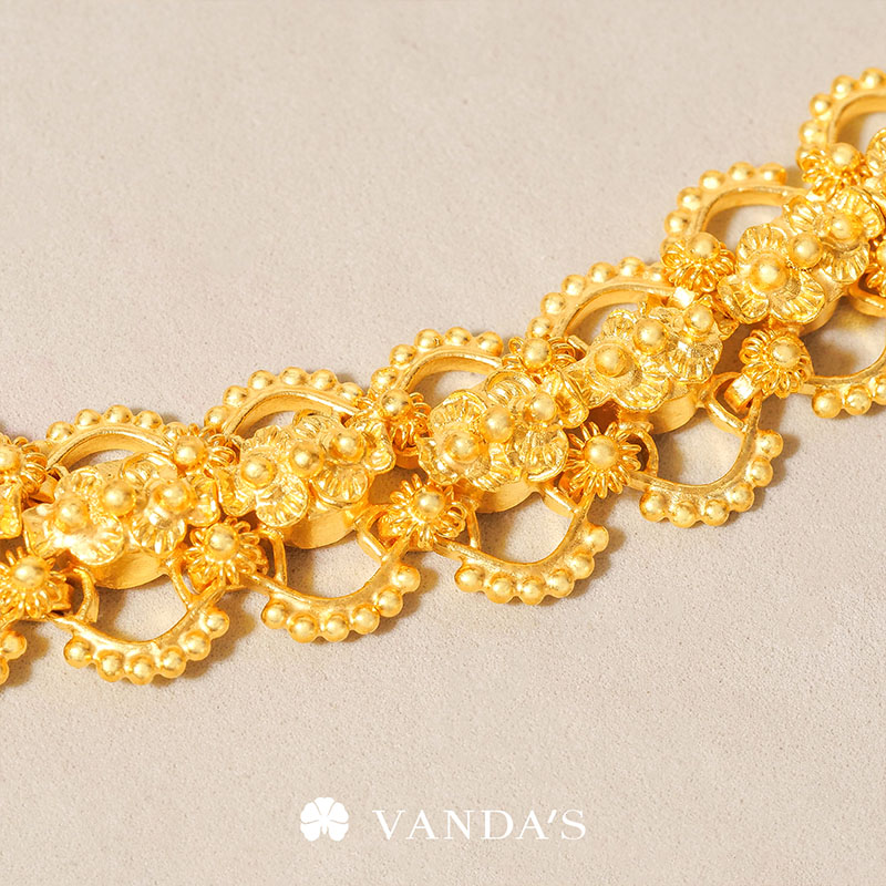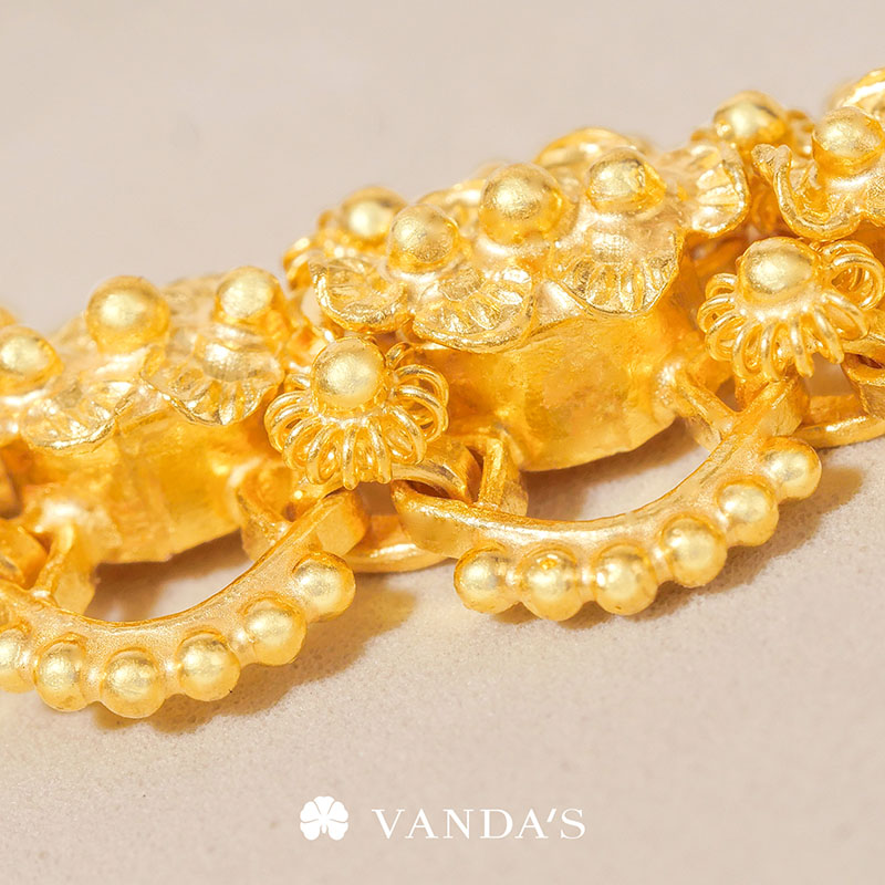 ‘ภุมริน’ สร้อยข้อมือทองคำ ดีไซน์ดอกผีเสื้อ งานทองโบราณจากช่างฝีมือผู้ชำนาญการ รังสรรค์จากทองคำบริสุทธิ์ ดีไซน์รูปทรงกลีบบัว ลายดอกผีเสื้อทองคำได้รับแรงบันดาลใจจากดอกผีเสื้อแสนสวย ช่างบรรจงรังสรรค์โดยใช้เทคนิคการดุนลายให้มีมิติความนูนเว้าของลวดลายดอกผีเสื้อ บิดดัดกลีบดอกให้มีความโค้งงอพลิ้วไหว มีชีวิตชีวา นำมาวางเรียงซ้อนกันบนโครงรูปทรงกลีบบัว ขอบเดินลายจุดไข่ปลาเสริมให้ดูงดงามและมีมิติยิ่งขึ้น นำมาเชื่อมต่อร้อยเรียงกันด้วยห่วงดอกพิกุลจิ๋ววางคู่ขนานกันตลอดทั้งเส้น จนได้สร้อยข้อมือลวดลายดอกผีเสื้อที่สวยงาม ประณีต และเปี่ยมล้นด้วยเสน่ห์แห่งศิลปะไทย