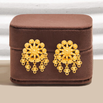 “ต่างหูทองคำ พิกุลชบาห้อยตุ้งติ้ง” ต่างหูแบบแป้น รังสรรค์จากทองคำแท้เปอร์เซ็นต์สูง โดยช่างผู้ชำนาญ ดีไซน์ดอกพิกุลชบาบรรจงขึ้นโครงดอกพิกุลขนาดใหญ่ และกลีบดอกดีไซน์ให้มีความโค้งมน ปลายกลีบดอกทั้ง 10 กลีบ บรรจงปะวางดอกพิกุลจิ๋วที่รังสรรค์ขึ้นด้วยความประณีต จนได้ดอกพิกุลชบาที่งดงาม เพิ่มความพลิ้วไหวด้วยกาาห้อยประดับพู่พิกุลจิ๋ว กลายเป็น “ต่างหูพิกุลชบาห้อยตุ้งติ้ง” อันสวยงาม และมีเสน่ห์ที่เปี่ยมล้นด้วยงานศิลปะแบบไทยผสานกับดีไซน์ที่ทันสมัยได้อย่างลงตัว