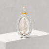 จี้ล็อกเก็ตหินทรงกลม พระฉายาลักษณ์เสด็จพ่อ ร. 5 เลี่ยมกรอบทองโบราณ 99.99% ตามรูปทรงของเหรียญดีไซน์ดูอ่อนช้อยลักษณะคล้ายกลีบดอกไม้ ด้านในฉลุลายเดินลายพันเกลียวลวด ด้านในปะเม็ดไข่ปลารอบกรอบอย่างลงตัว ด้านหลังฉลุลายไทย เพื่อเก็บงานให้ดูสวยงามยิ่งขึ้น