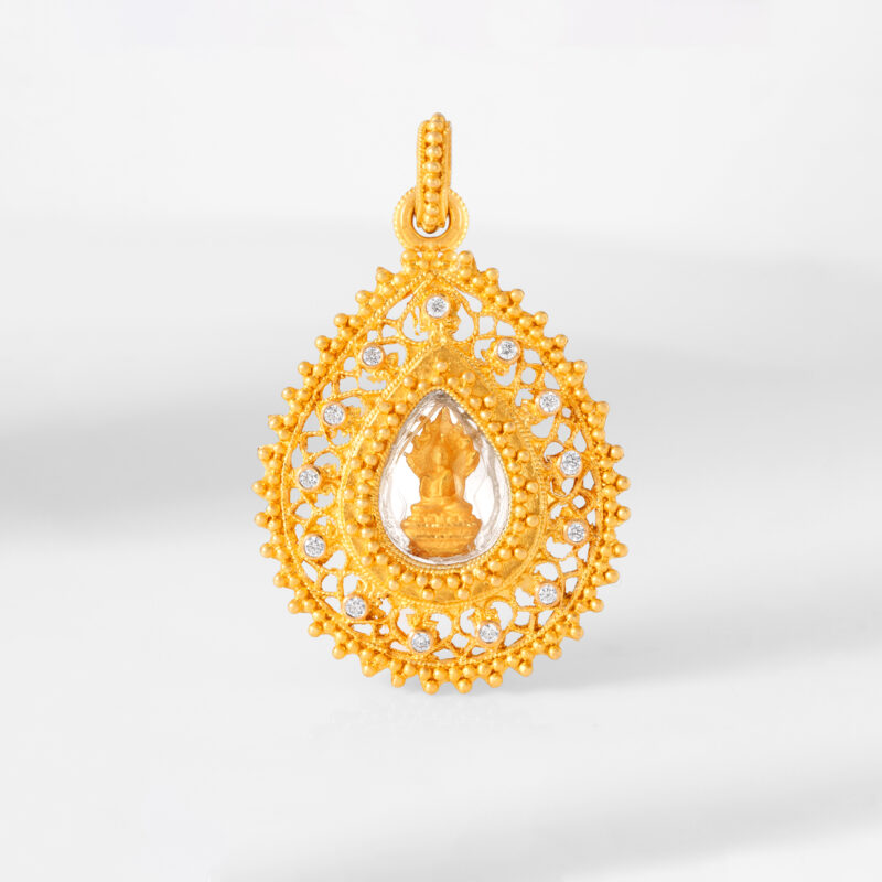 รังสรรค์ความวิจิตรด้วยฝีมือช่างทองคำผู้ชำนาญ ฉลุลายเครือเถา ลายมงคลที่สื่อถึงความเจริญงอกงาม ความรุ่งเรือง ล้อมรอบกรอบตามรูปทรงอย่างอ่อนช้อย สวยงาม เพิ่มมิติความงามด้วยการปั้นไข่ปลาเม็ดจิ๋วประดับตามกรอบด้านใน และขอบกรอบพระ เพิ่มความงดงาม แวววาว และโดดเด่นเป็นสง่าด้วยการประดับเพชรแท้ ที่คัดสรรเฉพาะเพชรน้ำ 100 D-Color/VVS1 ฝังแบบหุ้ม จำนวน 13 เม็ด น้ำหนักรวม 0.13 กะรัต โดยเว้นระยะห่างแต่ละเม็ดได้อย่างสวยงาม ลงตัว