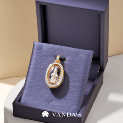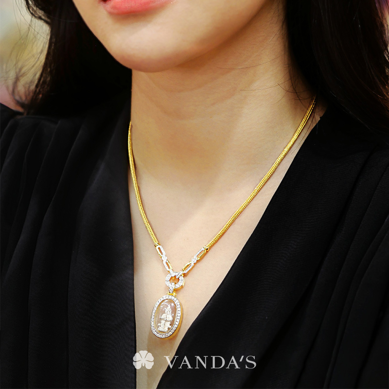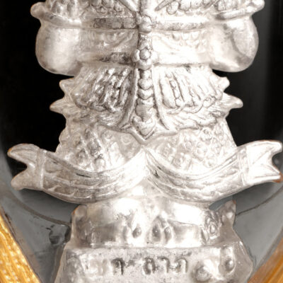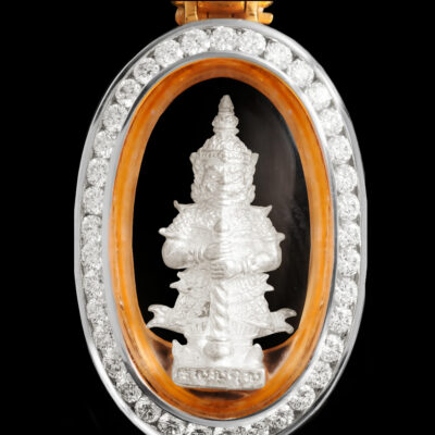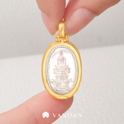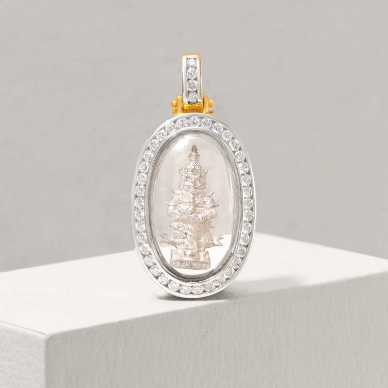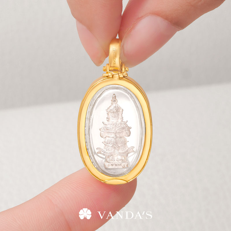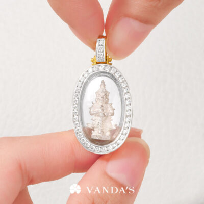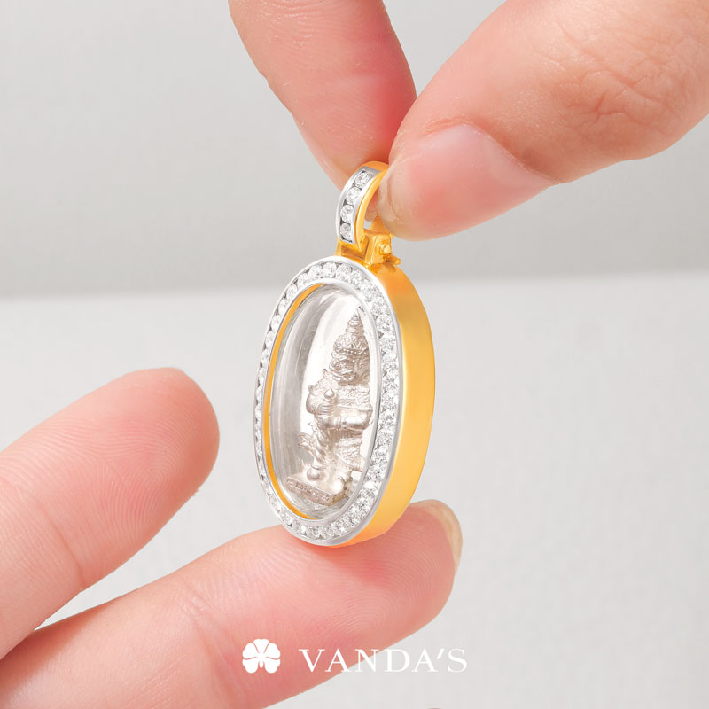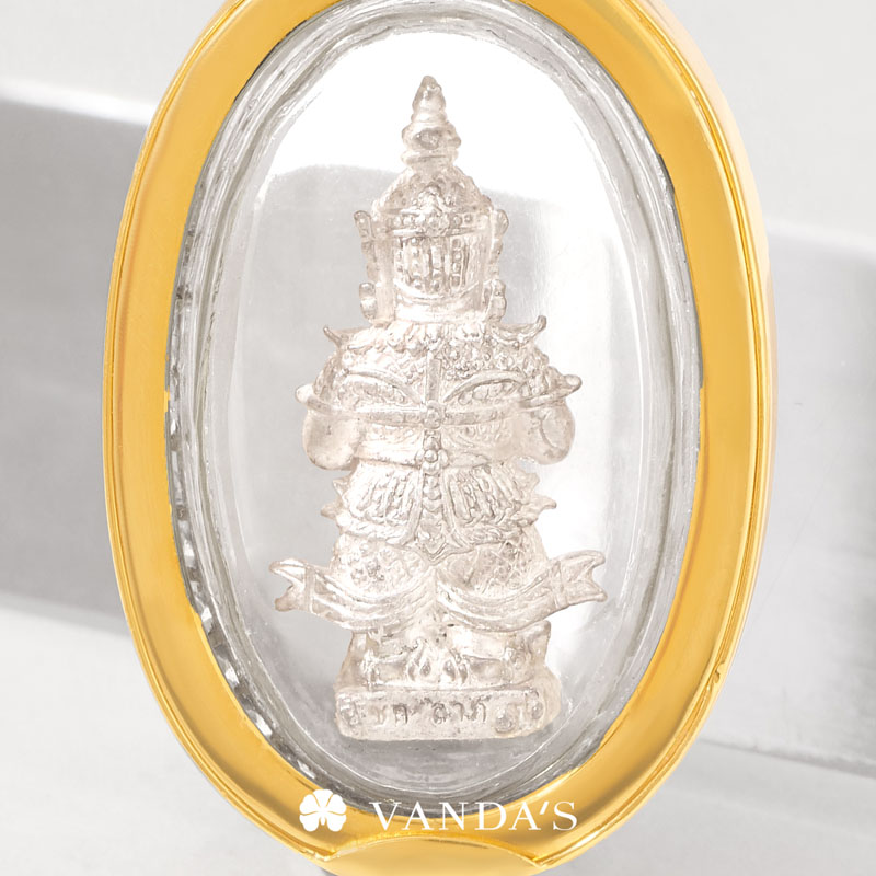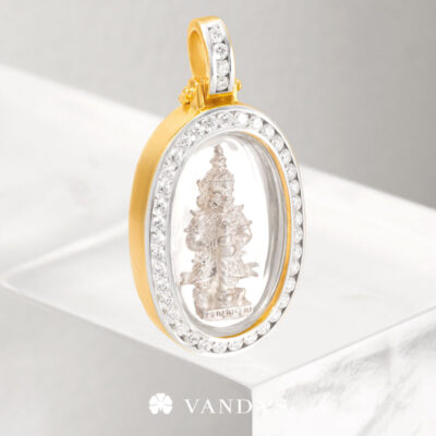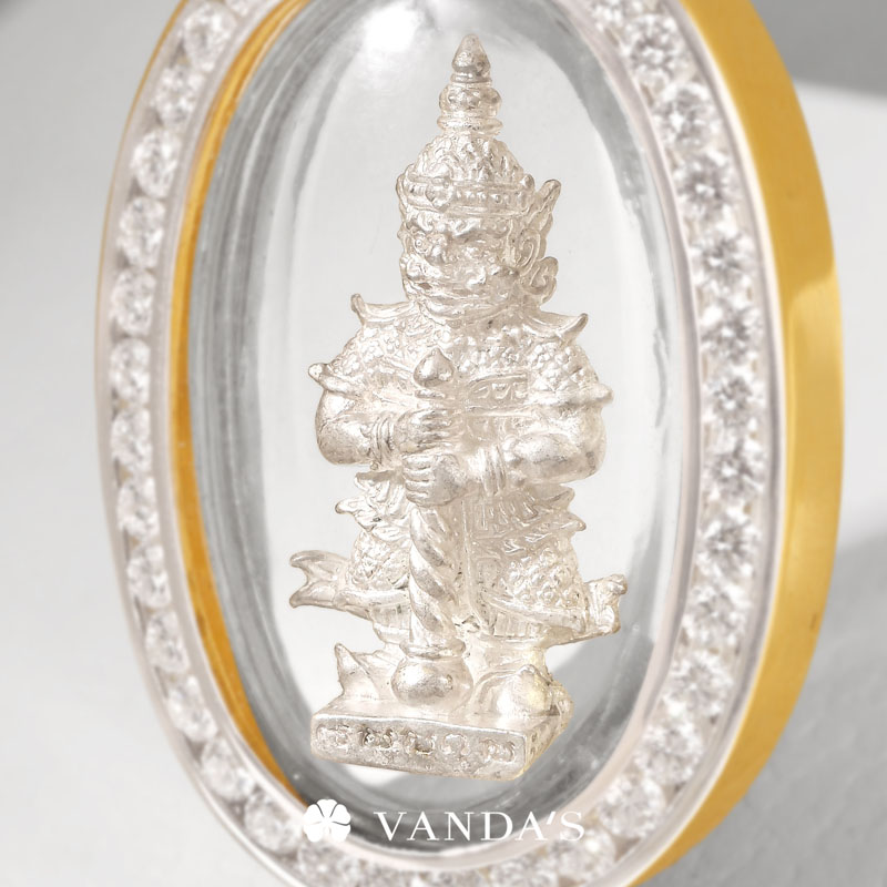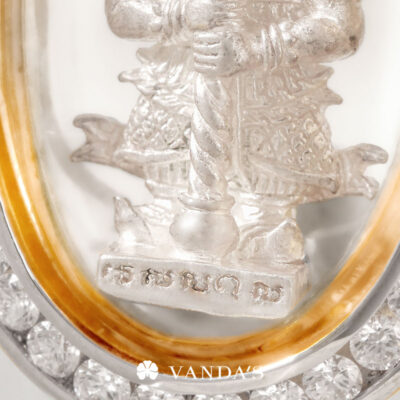 จี้ท้าวเวสสุวรรณ เนื้อเงิน หลวงพ่อฟู วัดบางสมัคร จ.ฉะเชิงเทรา รุ่นแซยิด ๘๘ “โชค ลาภ ฟู” ปี 2552 ขนาดสูงเพียง 1.7 ซม. เข้าพิธีใหญ่ จัดสร้างจำนวนน้อยเพียง 2,552 องค์เท่านั้น วัตถุมงคลที่เปี่ยมด้วยพุทธศิลป์ที่ละเอียดอ่อน ประณีต หายาก มากด้วยพุทธคุณที่หลากหลาย เต็มไปด้วยศรัทธาจากสาธุชนทั่วไป โดยรังสรรค์เลี่ยมมาในตลับทองคำเงางาม ที่แฝงด้วยความเรียบหรู คัดเพชรแท้ Brilliant Cut น้ำสวยใสสะอาดระดับ 100 D-Color/VVS มาฝังประดับล้อมรอบหน้าตลับทรงรี ด้วยเทคนิคงานฝังแบบสอดเห็นเพชรสวยงามเต็มเม็ด ทรงคุณค่าไร้ที่ติ
