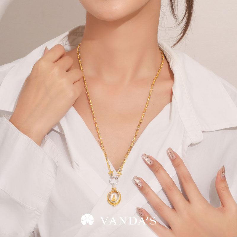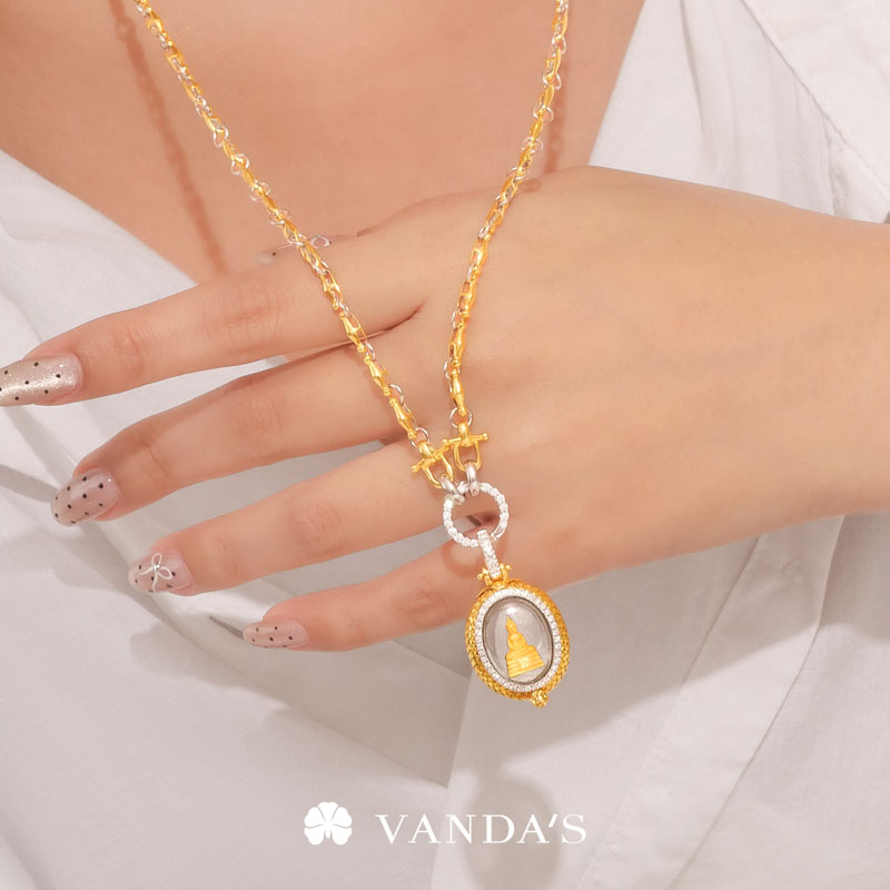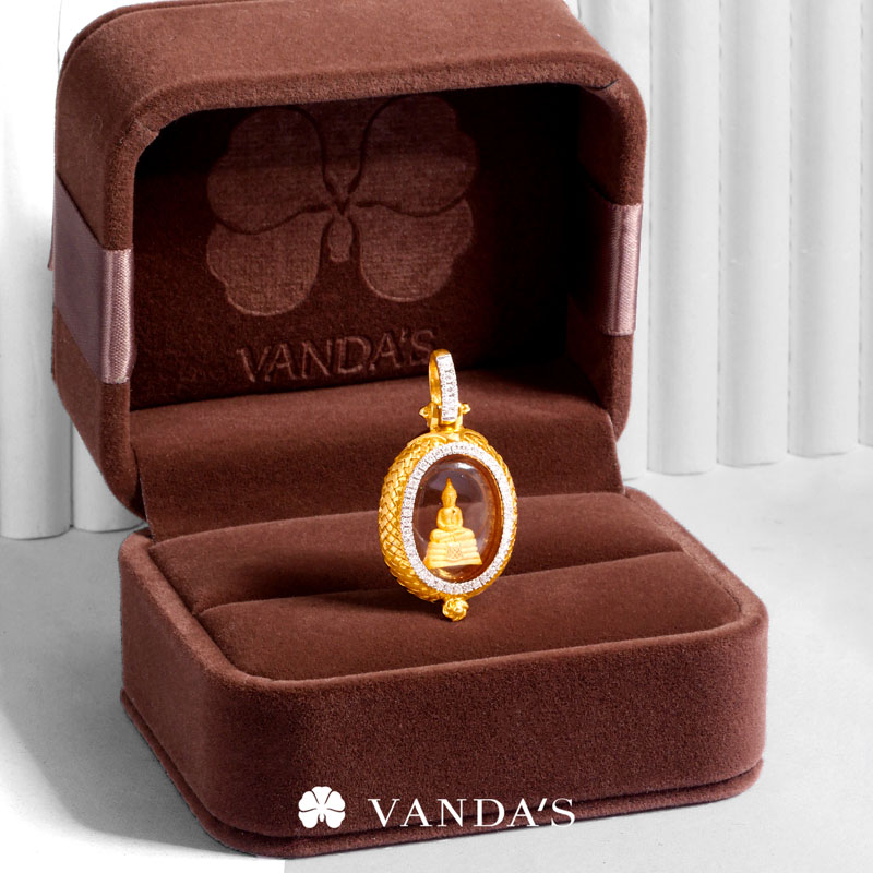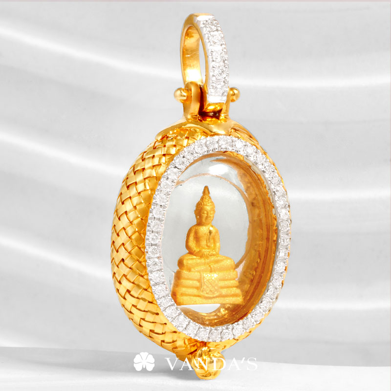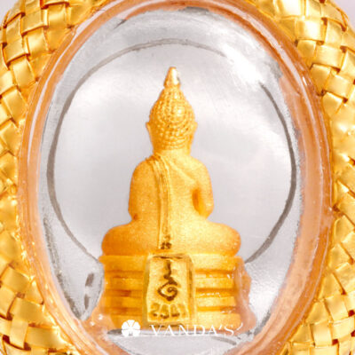 จี้พระหลวงพ่อโสธร เนื้อทองคำ (พิมพ์จิ๋ว) รุ่น ดวงชะตาคู่ชีวิต ปี 2547 เลี่ยมตลับทองคำถักสานตามรูปทรงขององค์พระ แบบเปิดเผยให้เห็นรายละเอียดที่คมชัดของเหรียญทั้งด้านหน้า และด้านหลัง พร้อมเพิ่มกิมมิคให้ดูมีมิติสวยงามยิ่งขึ้นด้วยการประดับเพชรแท้คัดพิเศษ จำนวน 43 เม็ด น้ำหนัก 0.43 กะรัต โดยใช้เทคนิคการฝังแบบเลื่อยเตย ล้อมรอบตลับพระด้านหน้า และบริเวณขั้วจี้ เสริมองค์พระด้านในให้โดดเด่น