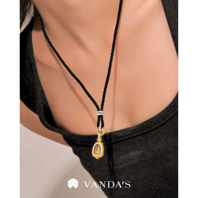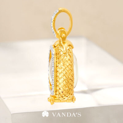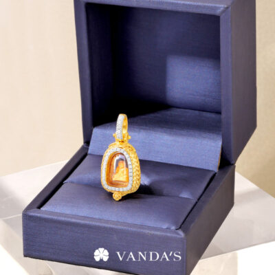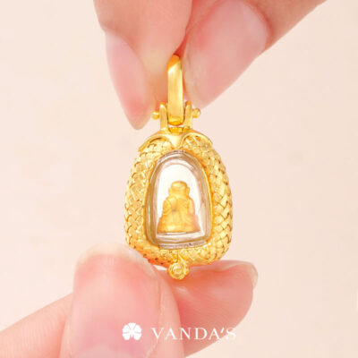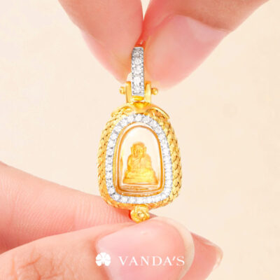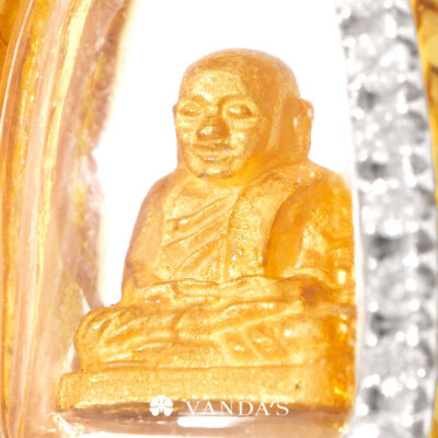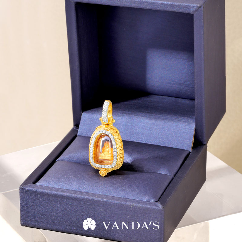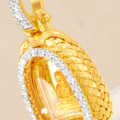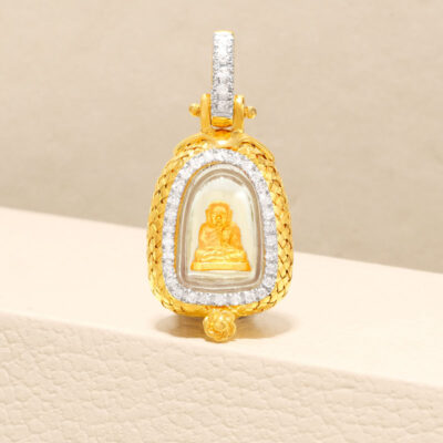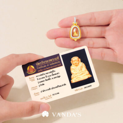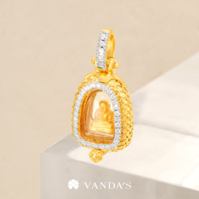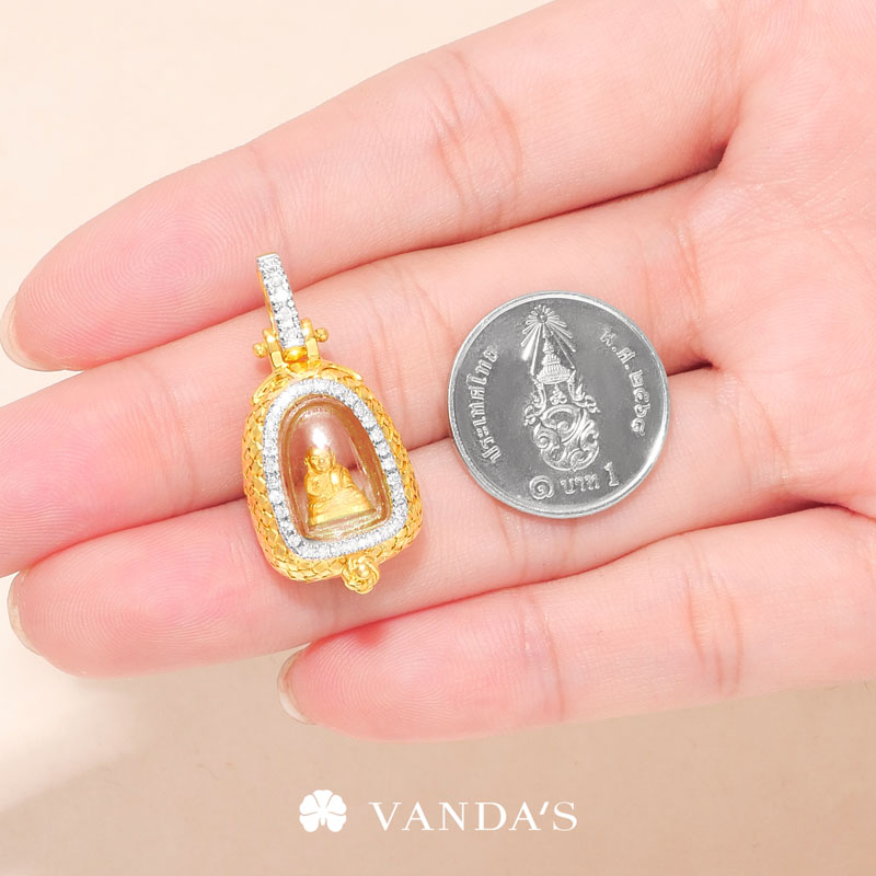 พิมพ์สวยคม พุทธลักษณ์งดงามในอิริยาบถนั่งขัดสมาธิ บริเวณใต้ฐานตอกโค๊ดทุกองค์ มาพร้อมบัตรรับรองพระแท้ (Certificate of Authenticity) ออกโดย นิตยสารพระท่าพระจันทร์ มาพร้อมนวัตกรรมงานเลี่ยมตลับทองคำถักสานตามรูปทรงขององค์พระ แบบเปิดเผยให้เห็นรายละเอียดขององค์พระหลวงพ่อเงิน เนื้อทองคำที่คมชัด พร้อมเก็บรายละเอียดให้ดูมีมิติสวยงามยิ่งขึ้นด้วยการประดับเพชรแท้คัดพิเศษ เฉพาะเพชรแท้น้ำ 100 D-Color/VVS1 จำนวน 35 เม็ด น้ำหนัก 0.35 กะรัต โดยใช้เทคนิคการฝังแบบเลื่อยเตย ล้อมรอบตลับพระด้านหน้า และบริเวณขั้วจี้ เสริมองค์พระด้านในให้มีความโดดเด่นมากยิ่งขึ้น