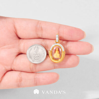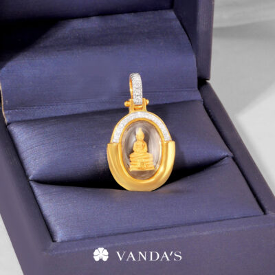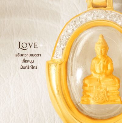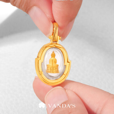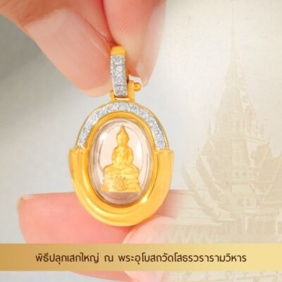 หลวงพ่อโสธร เนื้อทองคำแท้ (พิมพ์จิ๋ว) รุ่นอุดมโชคโภคทรัพย์ พิธีพุทธาภิเษกใหญ่ ณ วัดโสธรวรารามวรวิหาร จังหวัดฉะเชิงเทรา เลี่ยมตลับดีไซน์ “Lock” แรงบันดาลใจจากรูปทรง แม่กุญแจแห่งการปกป้อง สื่อถึงการ “ล็อกสิ่งดี ๆ ไว้กับตัว” ทั้งเรื่องโชคลาภ การเงิน และความปลอดภัยในชีวิต ตัวตลับออกแบบให้โค้งมนตามทรงไข่ ให้ความรู้สึกหรูหรา และร่วมสมัย พร้อมประดับด้วยเพชรแท้ ทรงกลม Brilliant Cut น้ำ 100 D-Color/VVS1 จำนวน 16 เม็ด รวมน้ำหนัก 0.20 กะรัต ทำให้ดูมีมิติสวยงาม ระยิบระยับเป็นประกาย จี้ขนาดเล็กกระทัดรัด เหมาะกับใส่ติดตัวตลอดวัน
