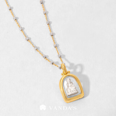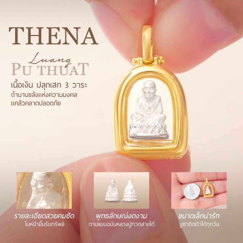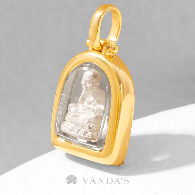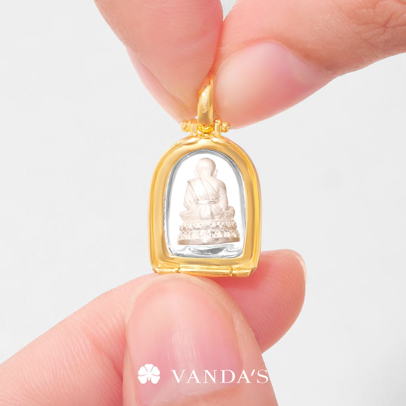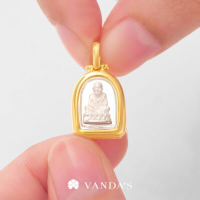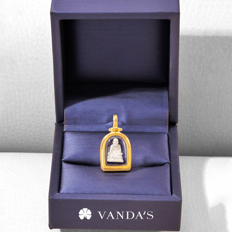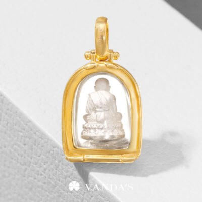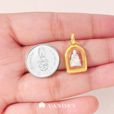 จี้หลวงปู่ทวด รูปหล่อองค์ลอย เนื้อเงิน รุ่น ปลุกเสก 3 วาระ ปี 2546 พิมพ์จิ๋ว เลี่ยมในตลับทองคำแท้ รูปทรงจอบ ดีไซน์เกลี้ยงเงา มีความเรียบง่าย ร่วมสมัย สามารถบูชาติดตัวได้จริงนชิวิตประจำวัน ขนาดกระทัดรัด สูง 2.2 ซม.และกว้าง 1.2 ซม. (รวมขั้วจี้)