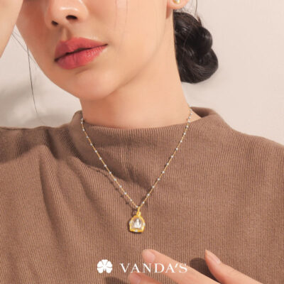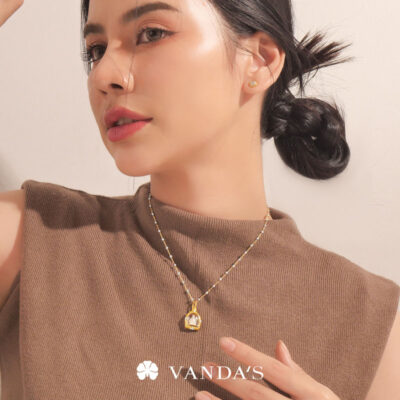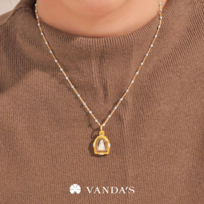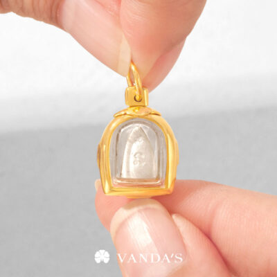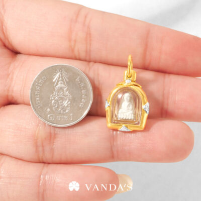 องค์พระถูกนำมาเลี่ยมใน ตลับดีไซน์ผ่าหวาย ที่ออกแบบให้รับกับองค์พระอย่างพอดี เพิ่มความสง่างามด้วย เพชรแท้ทรงสามเหลี่ยม ประดับบริเวณขั้วจี้ ช่วยเพิ่มประกายและดึงสายตาให้องค์พระโดดเด่น โดยยังคงรักษาความงดงามของพุทธศิลป์เดิมไว้อย่างลงตัว