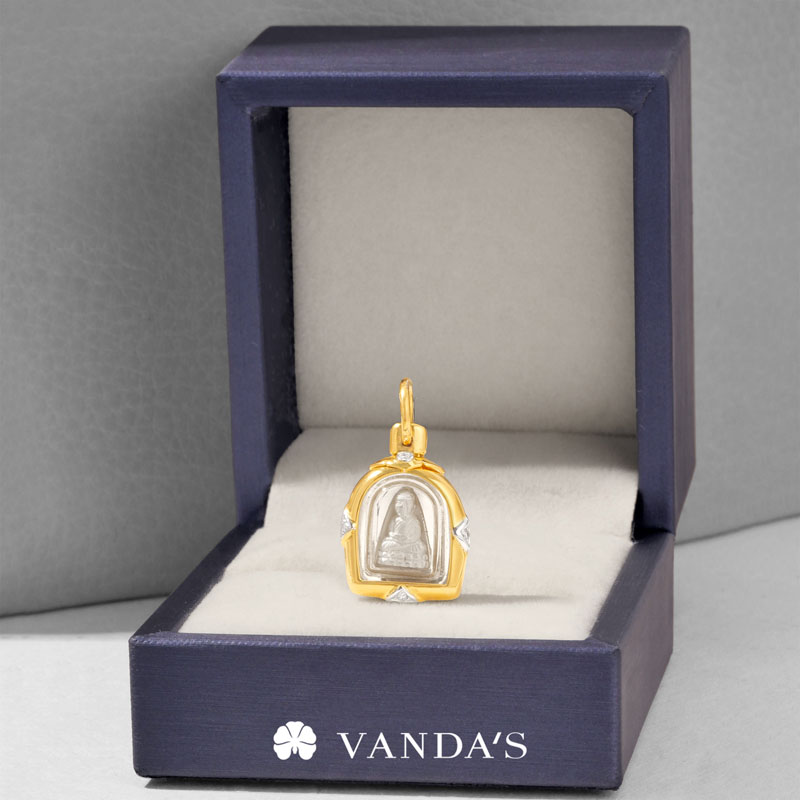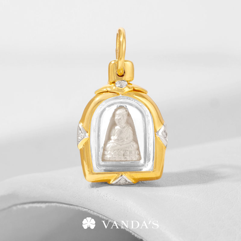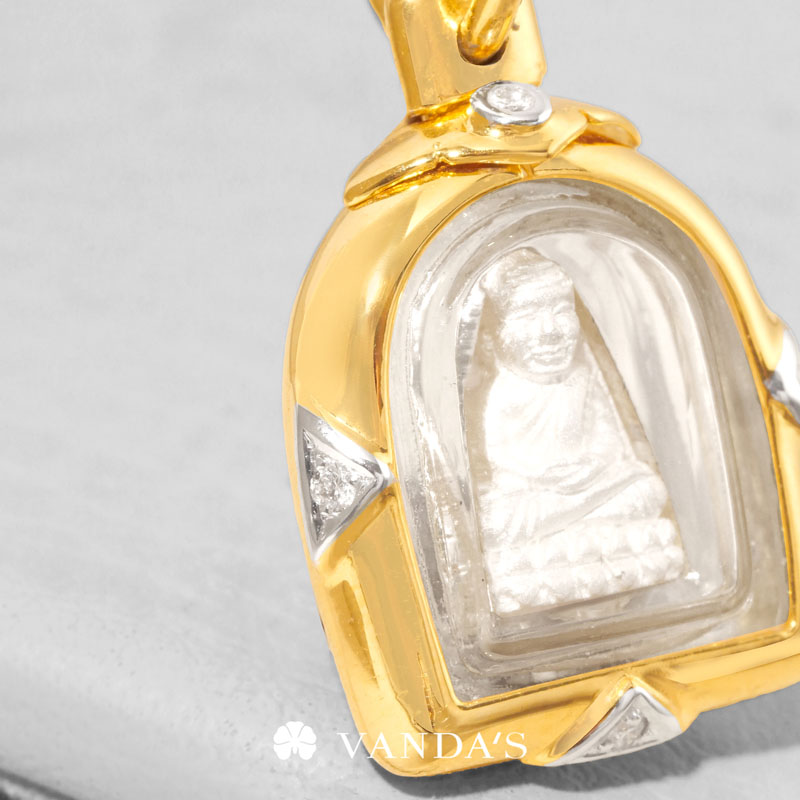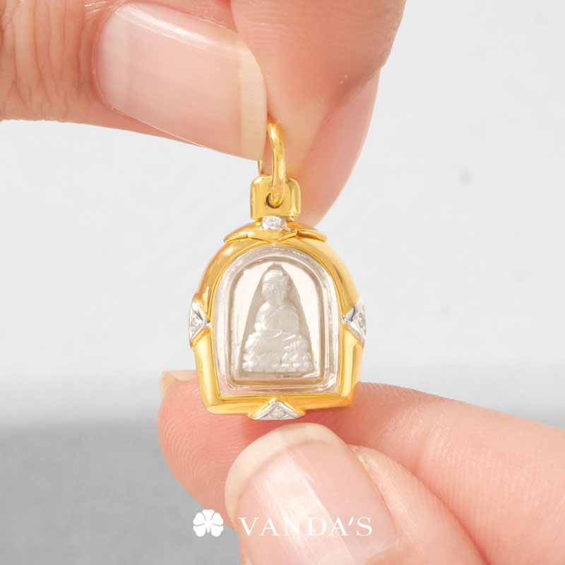 องค์พระถูกนำมาเลี่ยมใน ตลับดีไซน์ผ่าหวาย ที่ออกแบบให้รับกับองค์พระอย่างพอดี เพิ่มความสง่างามด้วย เพชรแท้ทรงสามเหลี่ยม ประดับบริเวณขั้วจี้ ช่วยเพิ่มประกายและดึงสายตาให้องค์พระโดดเด่น โดยยังคงรักษาความงดงามของพุทธศิลป์เดิมไว้อย่างลงตัว