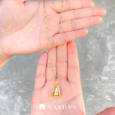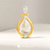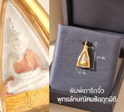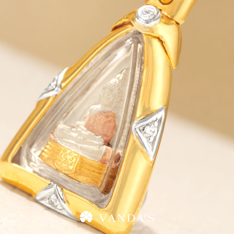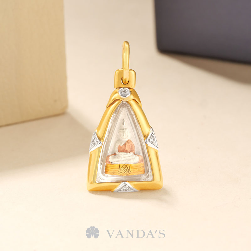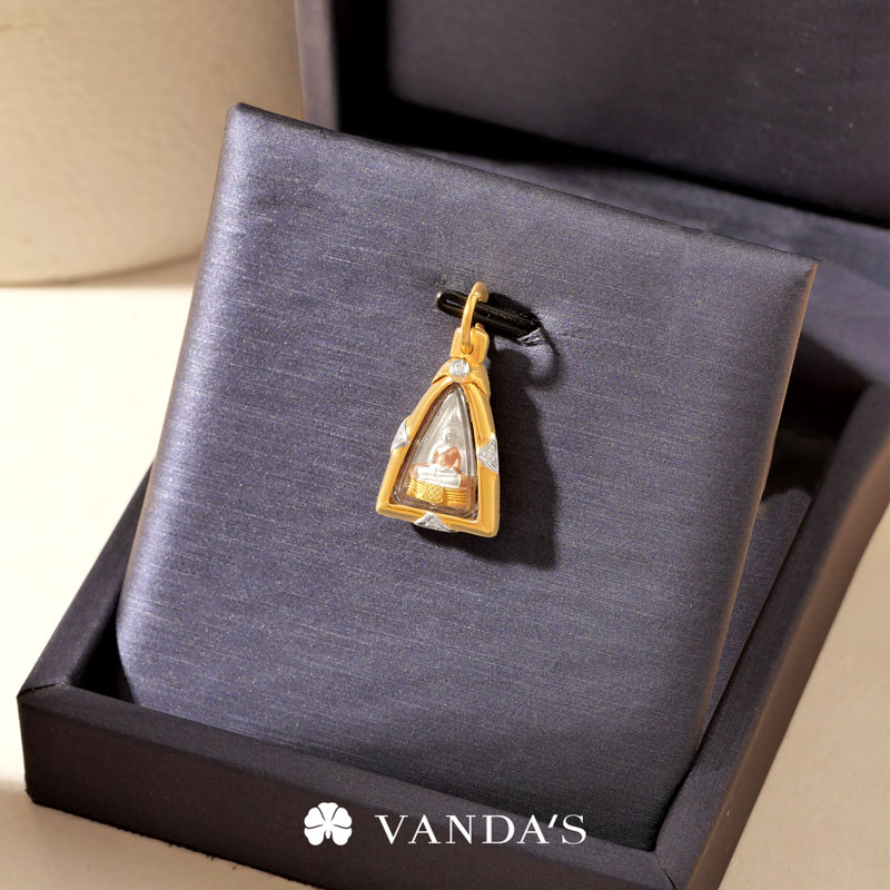 องค์พระบรรจุใน ตลับทองคำแท้ดีไซน์ผ่าหวาย ที่ออกแบบให้โค้งมนรับกับองค์พระด้านในอย่างลงตัว ตัวเรือนมีความเพรียว ไม่เทอะทะ ทำให้ลุคโดยรวมดูโฉบเฉี่ยวและทันสมัย เหมาะสำหรับการสวมใส่เป็นเครื่องยึดเหนี่ยวจิตใจในชีวิตประจำวัน