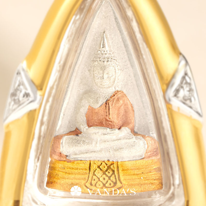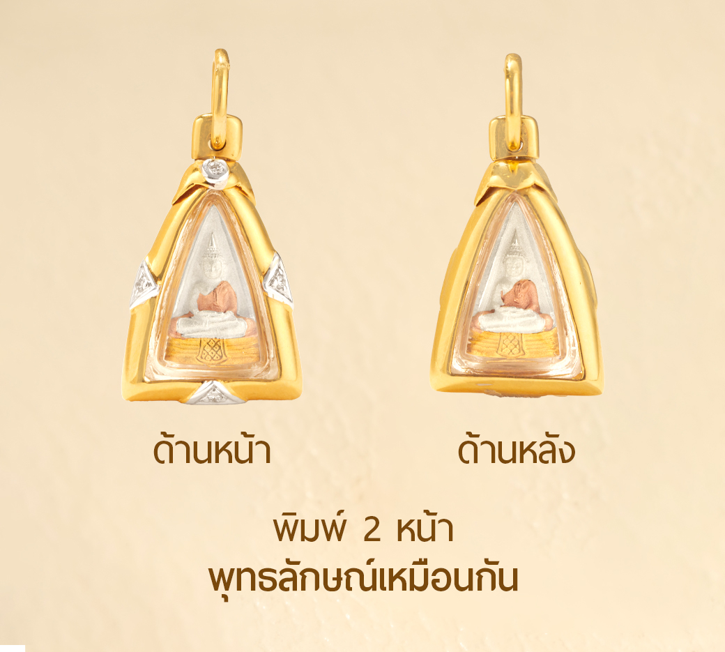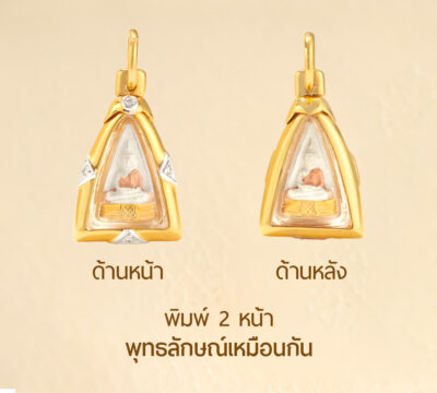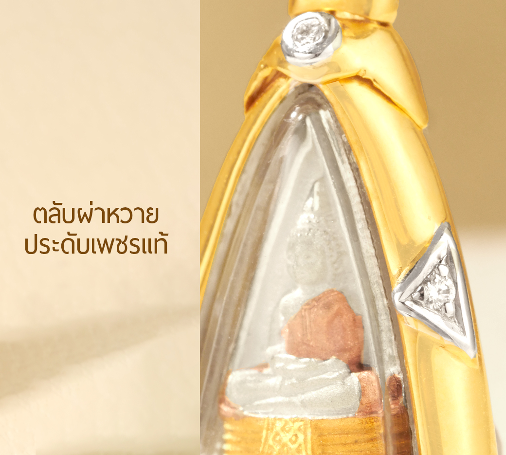 ตัวตลับประดับ เพชรแท้คัดพิเศษ 4 เม็ด น้ำหนักรวม 0.40 กะรัต ช่วยเพิ่มประกายและดึงสายตาให้ตัวองค์พระดูโดดเด่นยิ่งขึ้น อีกทั้งยังแฝงนัยยะมงคล เปรียบเสมือน การคุ้มครองทั้ง 4 ทิศ และความเจริญรุ่งเรืองรอบด้านแก่ผู้สวมใส่