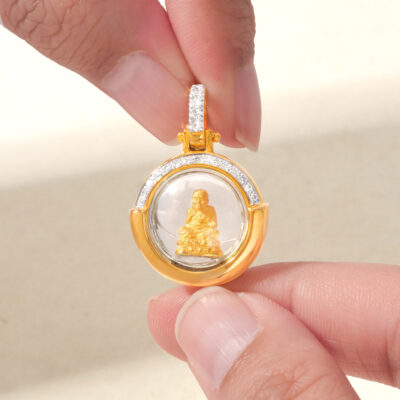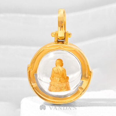 จี้หลวงปู่ทวด รูปหล่อองค์ลอย เนื้อทองคำ ปลุกเสก 3 วาระ ปี 2546 เลี่ยมตลับดีไซน์ “Lock” แรงบันดาลใจจากรูปทรง ‘แม่กุญแจ’ ที่ถูกตีความใหม่อย่างประณีต ด้านข้างของตัวเรือนออกแบบให้มี สเต็ปความสูง 2 เลเยอร์ แยกชั้นทอง–ชั้นเพชรอย่างชัดเจน สัญลักษณ์แห่งการปกป้อง สื่อถึงการ “ล็อกสิ่งดี ๆ ไว้กับตัว” ทั้งเรื่องโชคลาภ การเงิน และความปลอดภัยในชีวิต