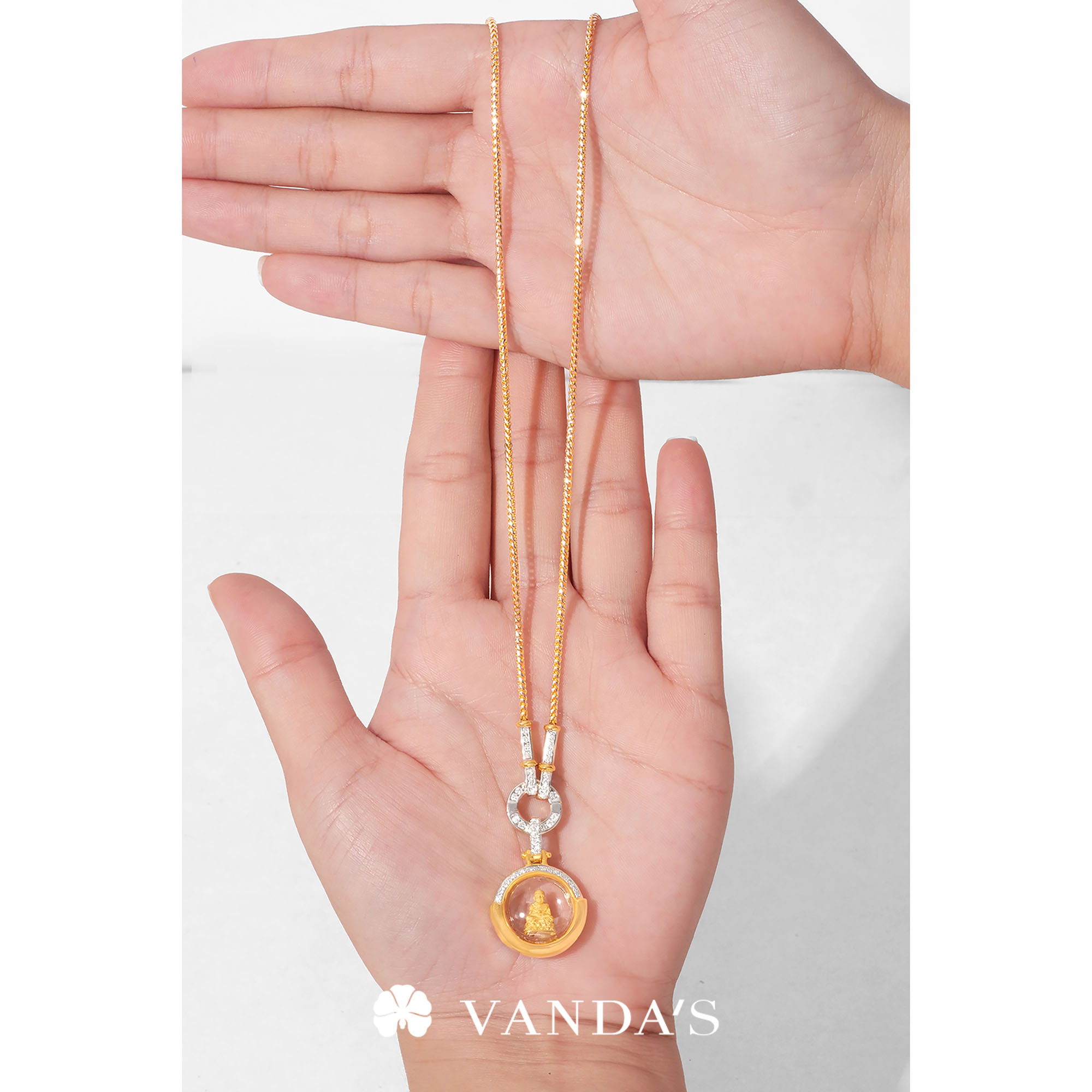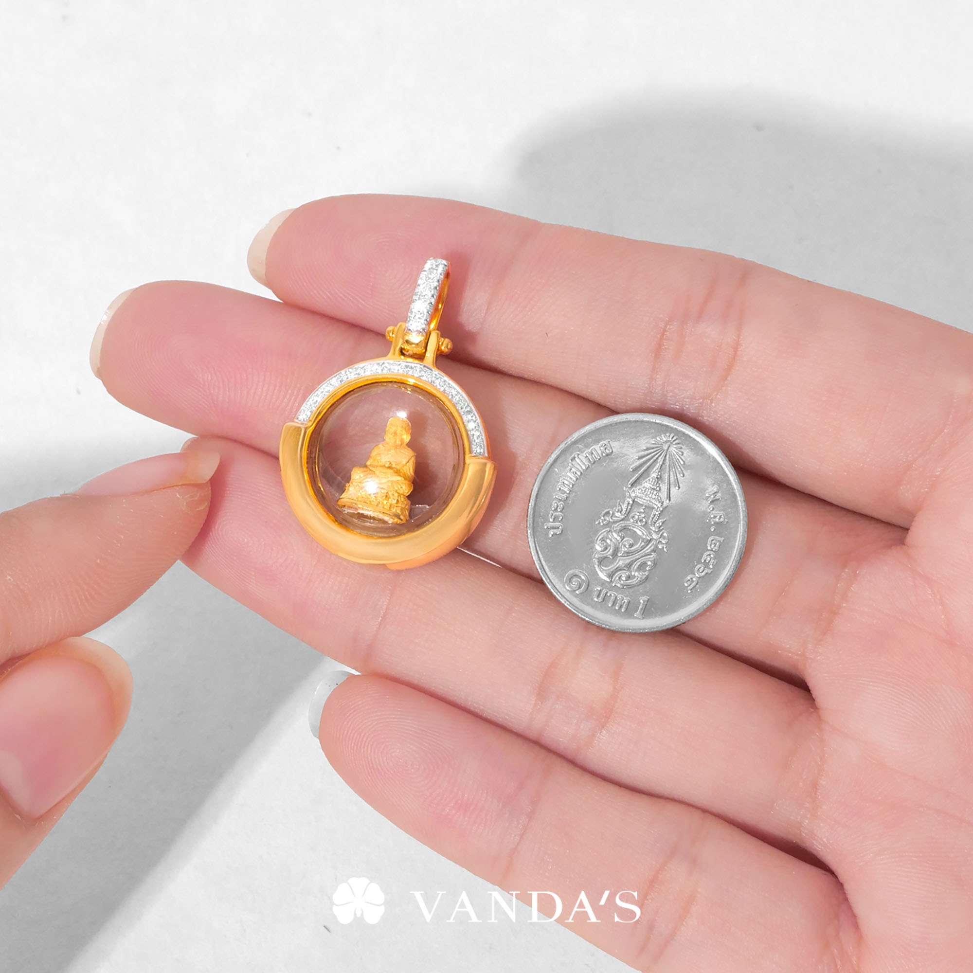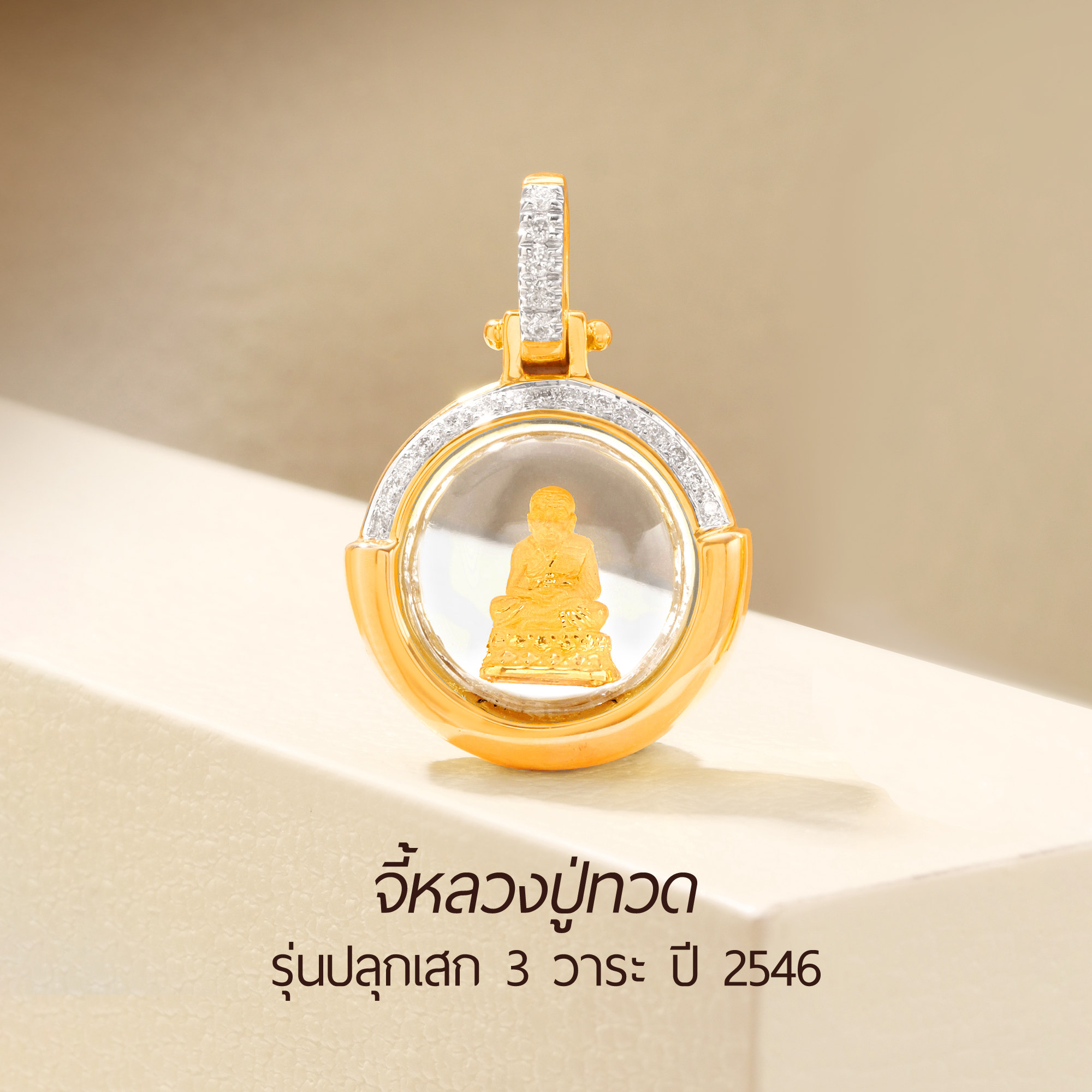 จี้หลวงปู่ทวด รูปหล่อองค์ลอย เนื้อทองคำ ปลุกเสก 3 วาระ ปี 2546 เลี่ยมตลับดีไซน์ “Lock” แรงบันดาลใจจากรูปทรง ‘แม่กุญแจ’ ที่ถูกตีความใหม่อย่างประณีต ด้านข้างของตัวเรือนออกแบบให้มี สเต็ปความสูง 2 เลเยอร์ แยกชั้นทอง–ชั้นเพชรอย่างชัดเจน สัญลักษณ์แห่งการปกป้อง สื่อถึงการ “ล็อกสิ่งดี ๆ ไว้กับตัว” ทั้งเรื่องโชคลาภ การเงิน และความปลอดภัยในชีวิต