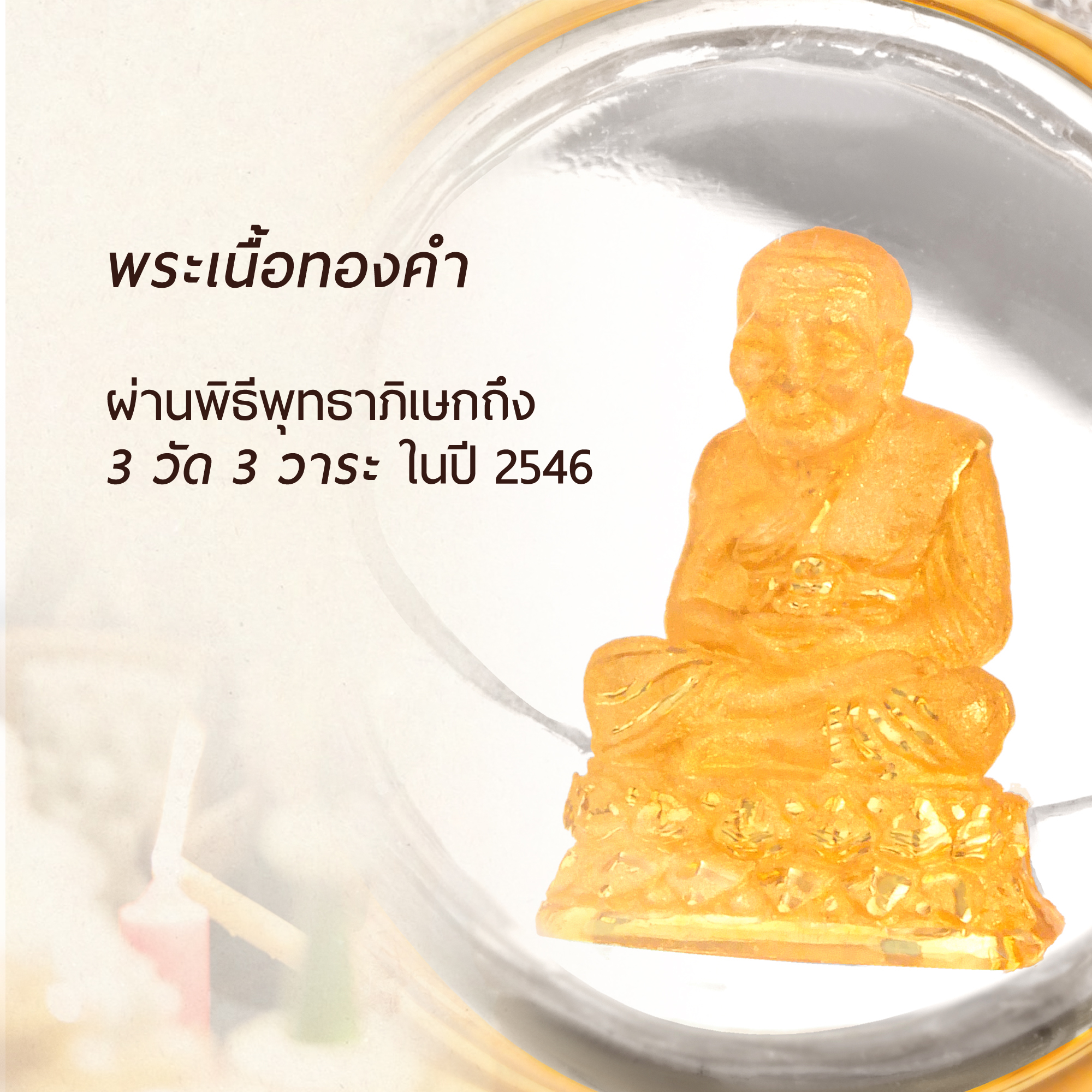 หลวงปู่ทวด เนื้อทองคำ รูปหล่อพิมพ์ขนาดจิ๋ว ผ่านพิธีพุทธาภิเษกครั้งยิ่งใหญ่ถึง 3 วัด 3 วาระ ได้แก่ วัดทรายขาว, วัดช้างให้ และวัดประสาทบุญญาวาส ในปี 2546 องค์พระมีพุทธลักษณ์ที่งดงาม มีขนาดฐานกว้าง 0.7 ซม. สูง 1.0 ซม. คงรายละเอียดคมชัดเจนประณีตทุกรายละเอียด